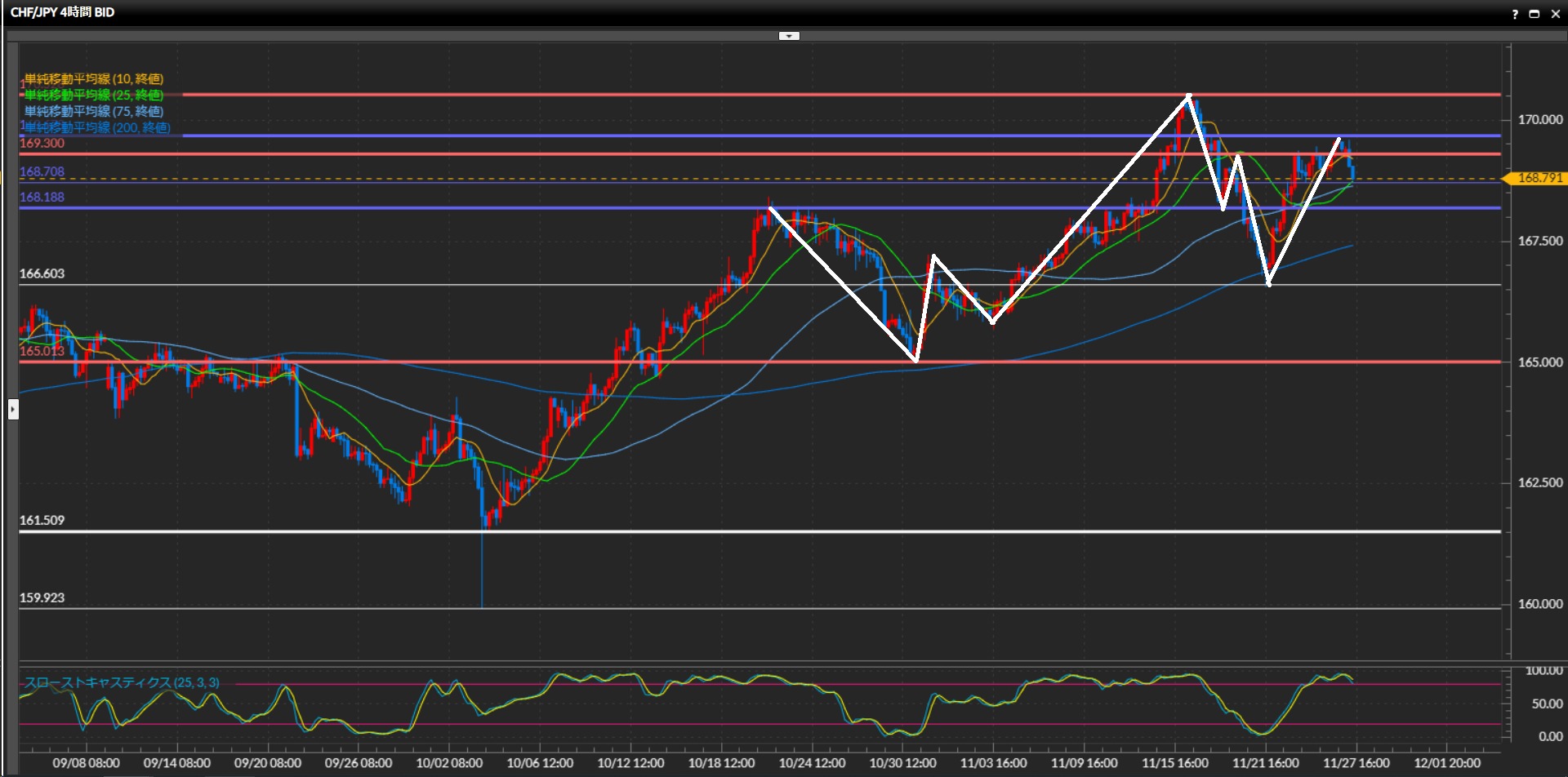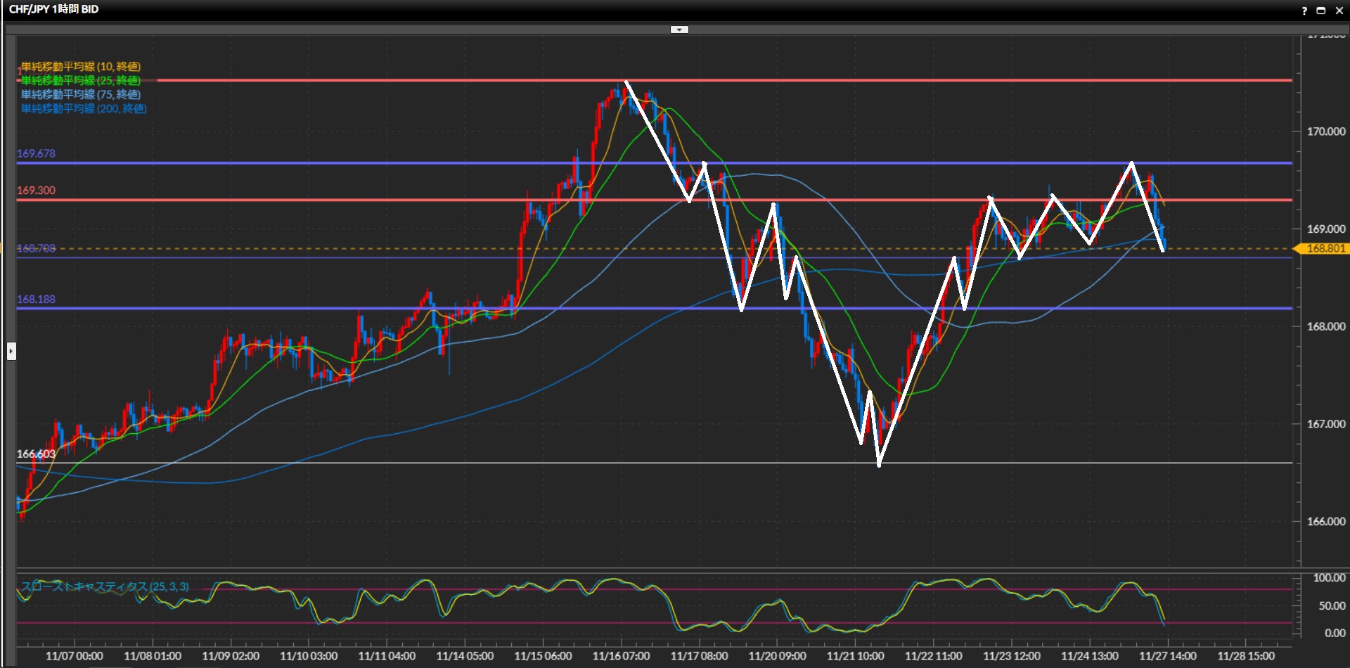 4時間足水平線169.30円があまり機能していない事や、1時間足の高値切上げ安値切下げの形を作った事に注意したい。