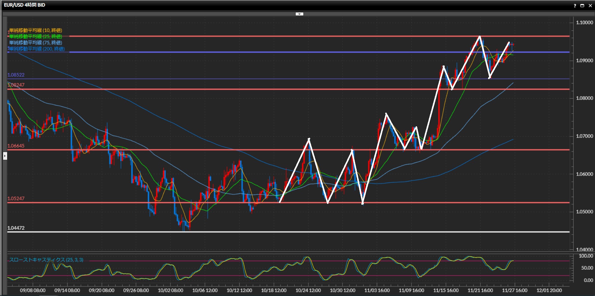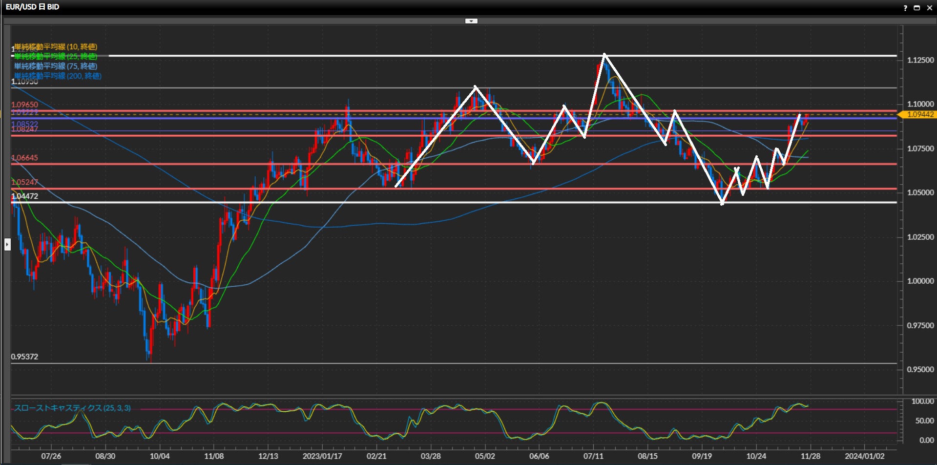 1.0825ドル-1.0965ドルの間の上下と捉え、小さな波で高値安値を切り上げている。