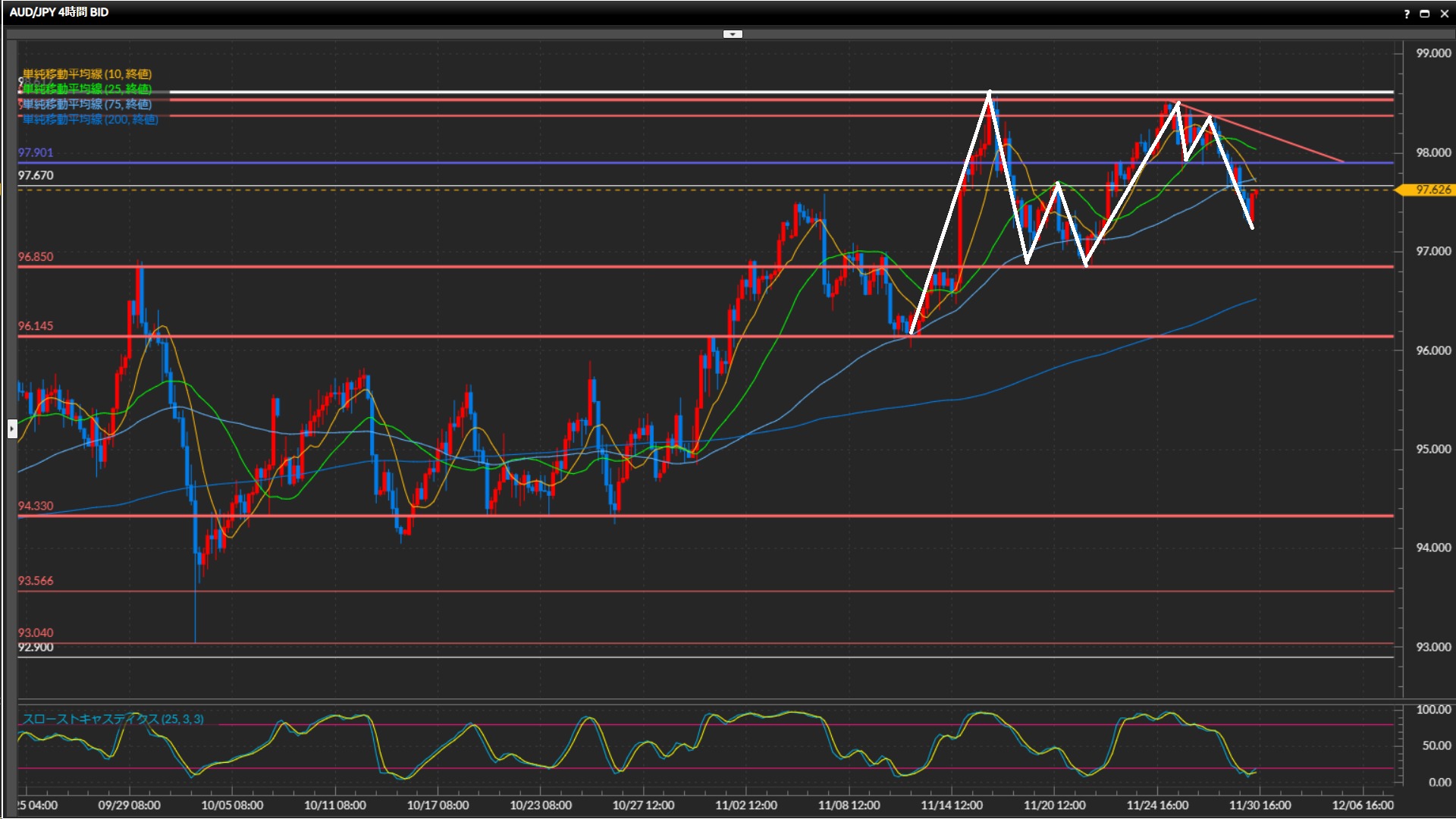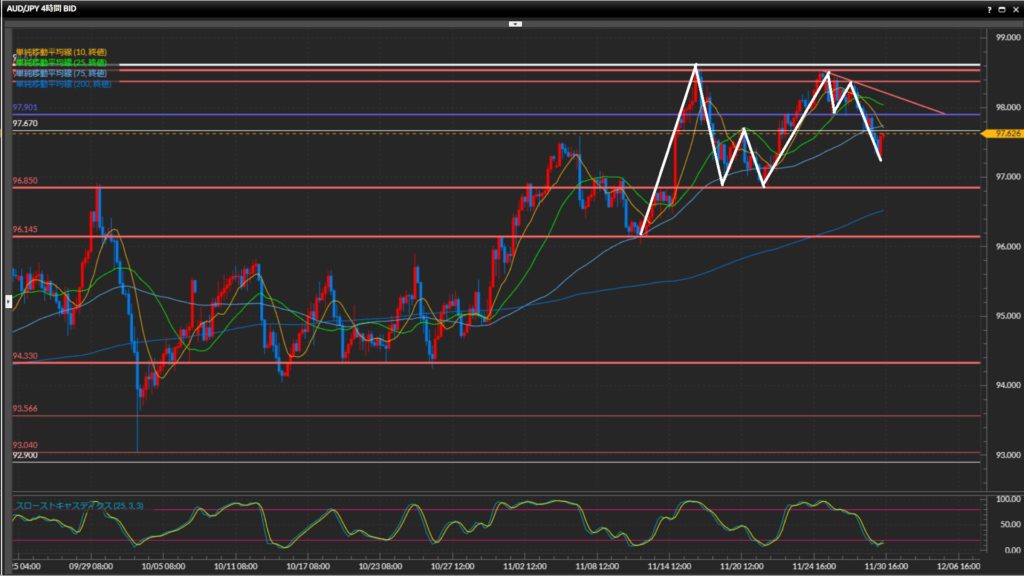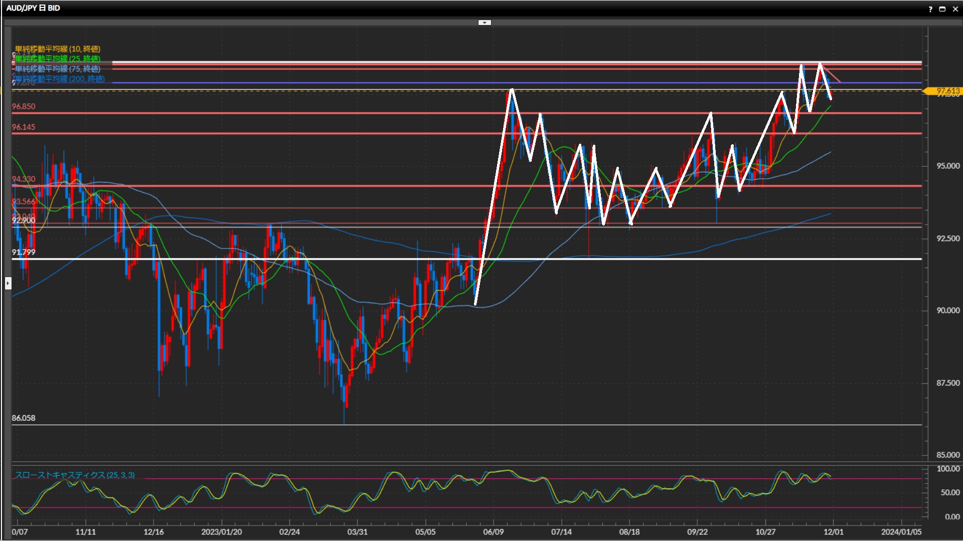 基本戦略はラインブレイクを確認してからのショート狙い。 - 豪ドル円は日足は上目線、4時間足〜1時間足は下目線。