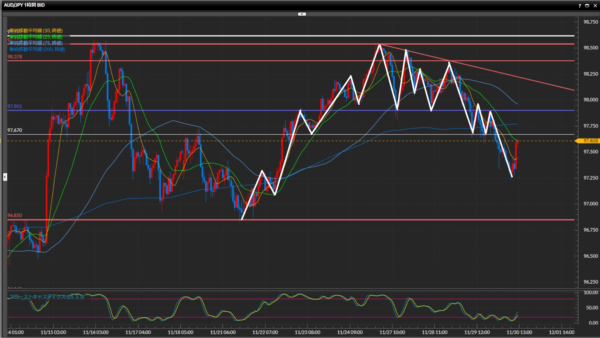 直近高値は97.90円で、切上げない限りはショート狙い。