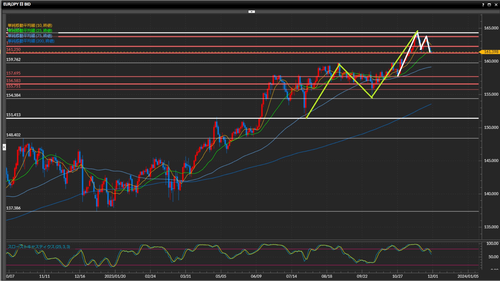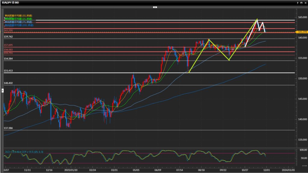 最高値164.30円を更新出来ないまま上昇の起点付近まで下落中。