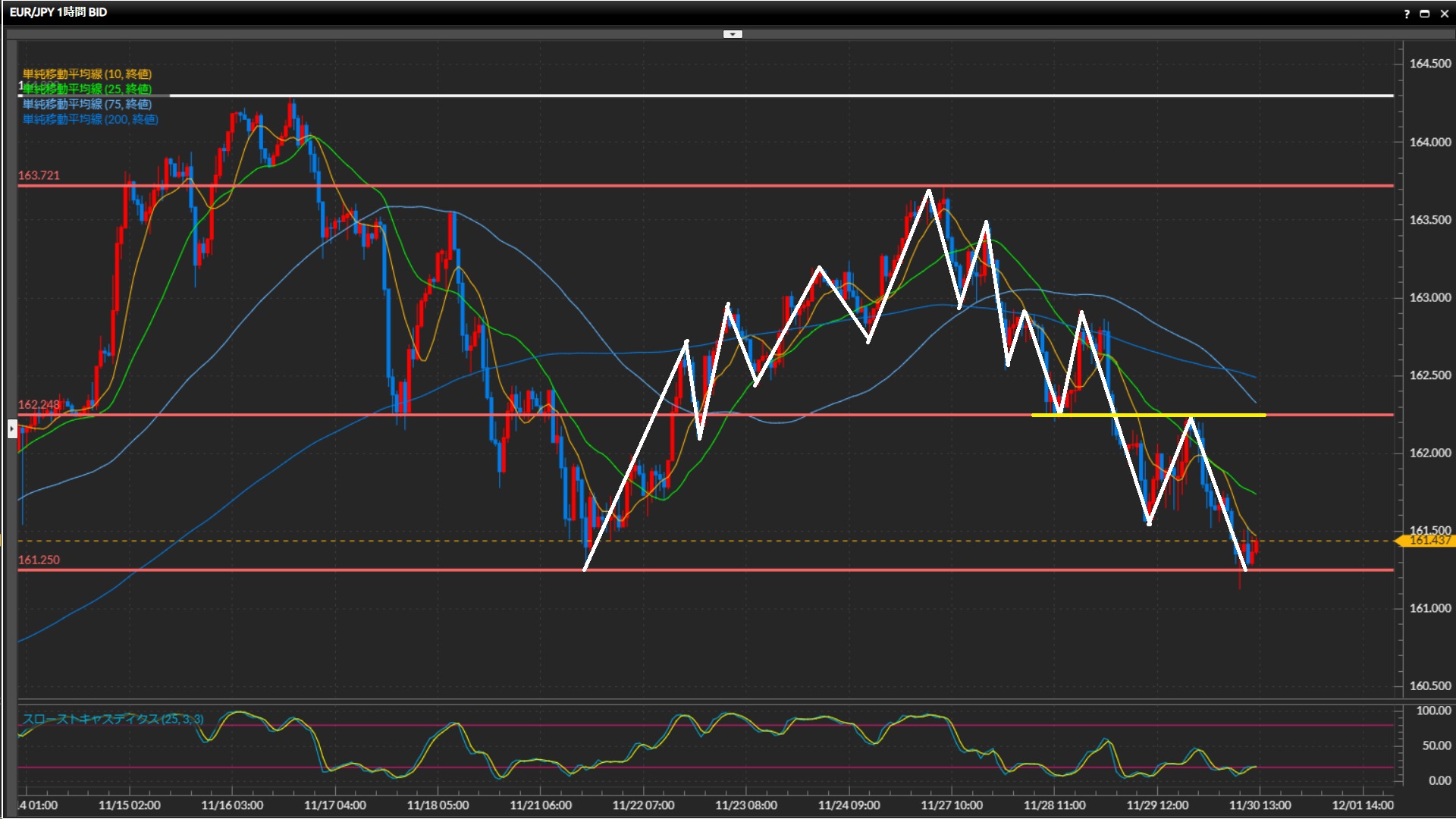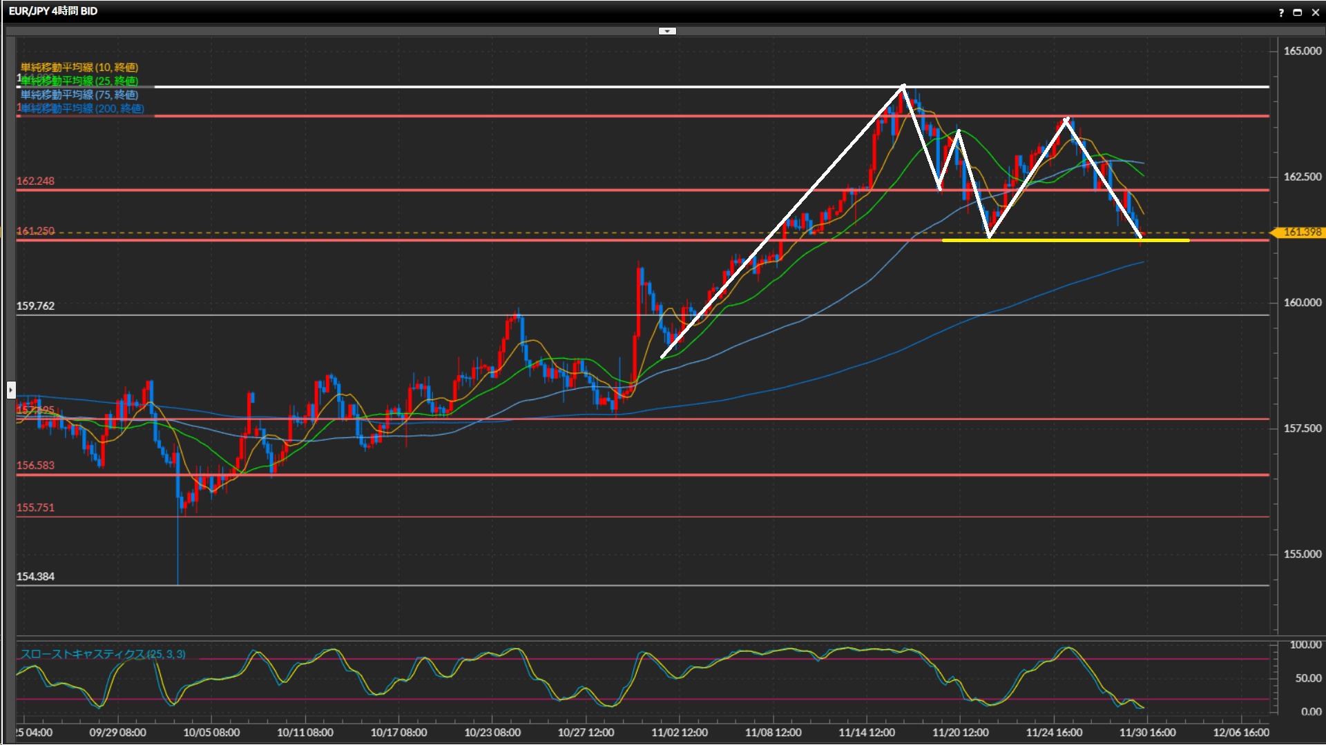 昨日から安値を切下げており、4時間足水平線161.25円の突破を試している。
