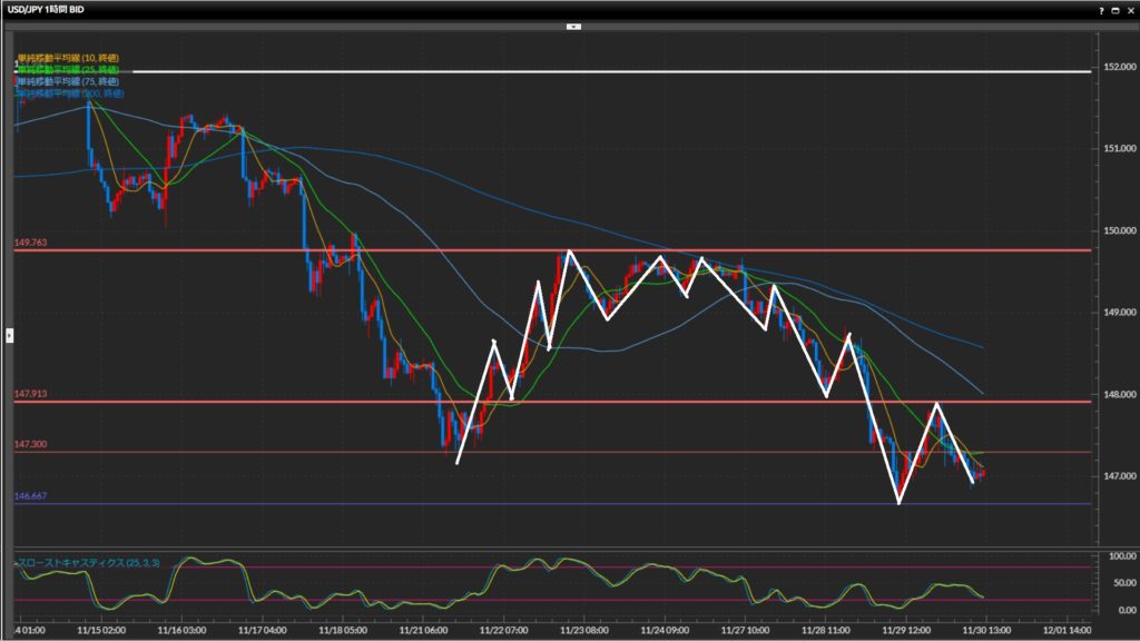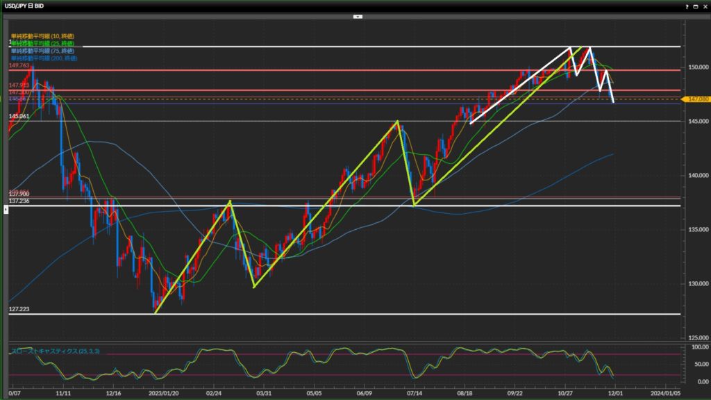 下値更新中。直近高値は147.91円で、切上げない限り下目線。