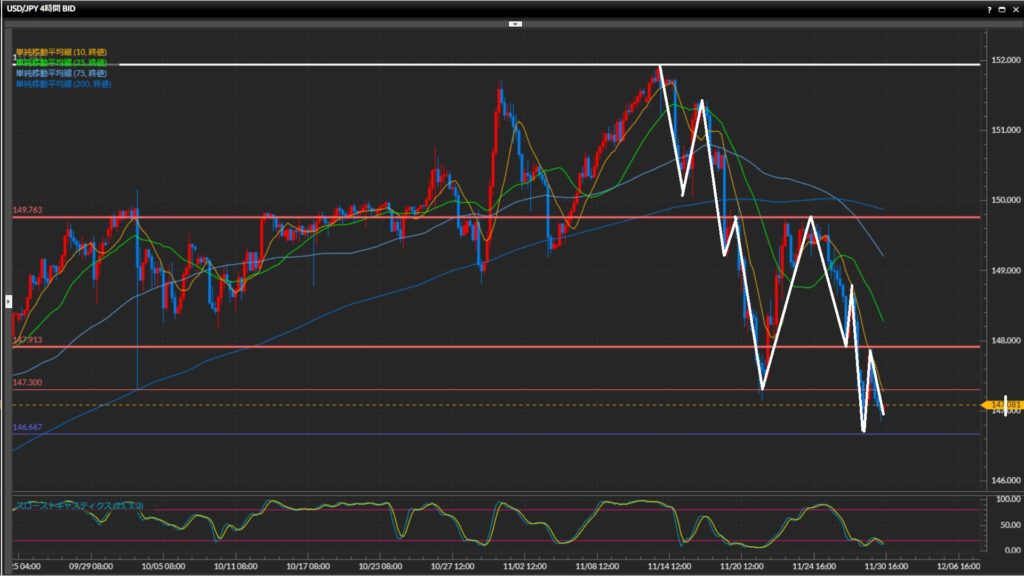 基本はショート狙いで、一旦日足水平線145.06円までが下値目標。