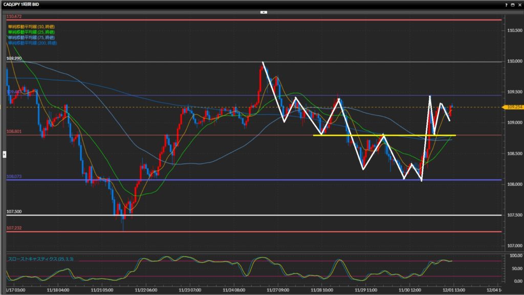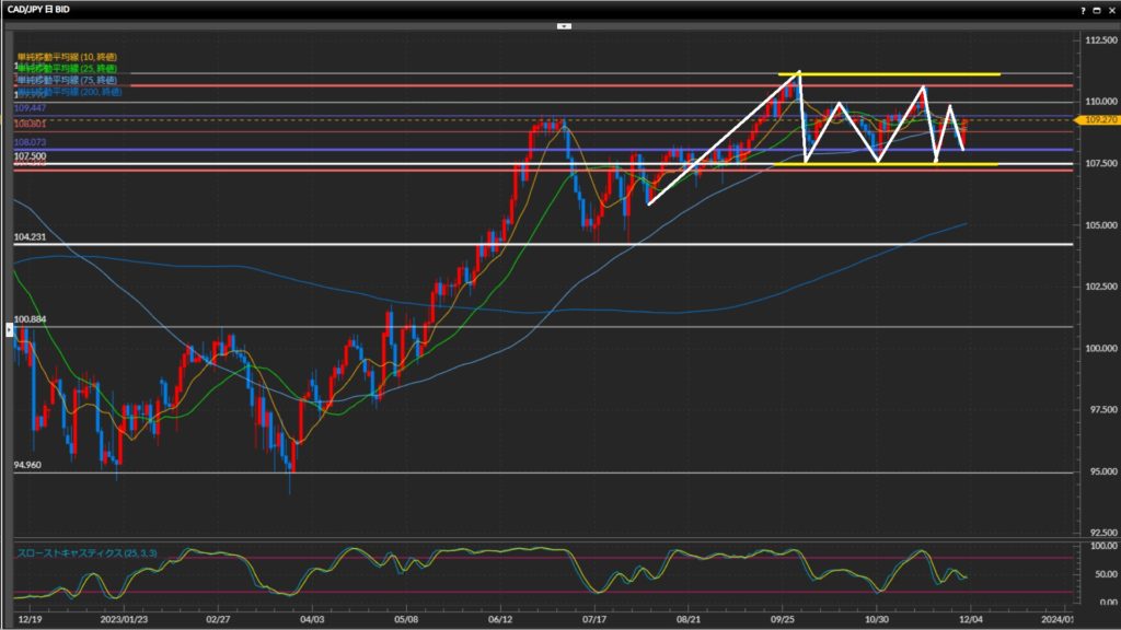 - 加ドル円は日足はレンジ、4時間足は下目線終了、1時間足は上目線終了。