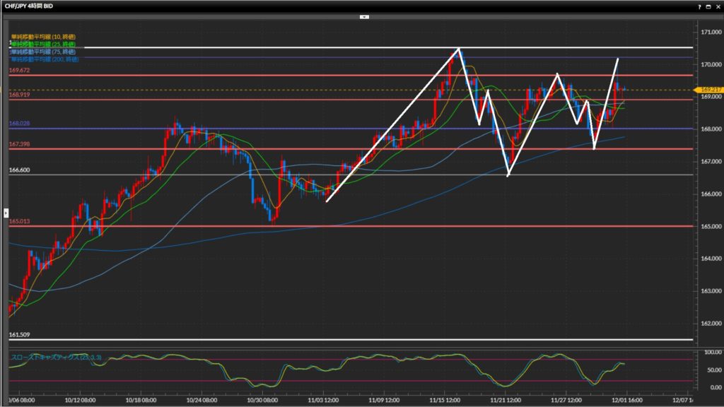 昨日は勢いで170.23まで高値更新しているが、4時間足ローソク実体が4時間足水平線169.67円を上抜け確定出来ていない事に注意する。