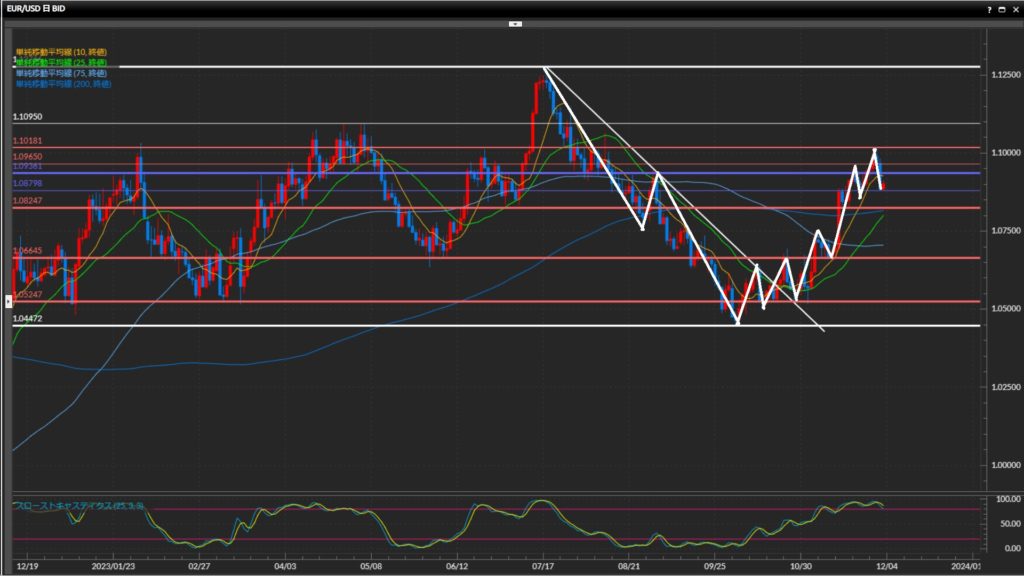 昨日の下落で75SMAを下抜けたものの、直近安値1.0853ドルを抜けない限りは上目線。