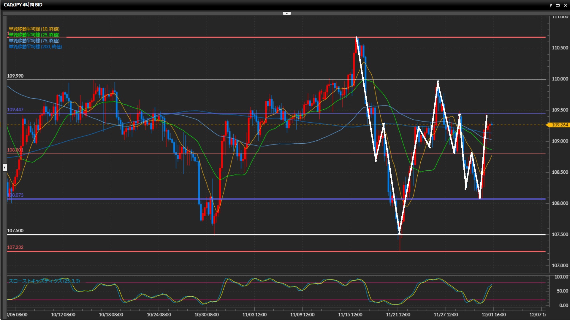 - 加ドル円は日足はレンジ、4時間足は下目線終了、1時間足は上目線終了。