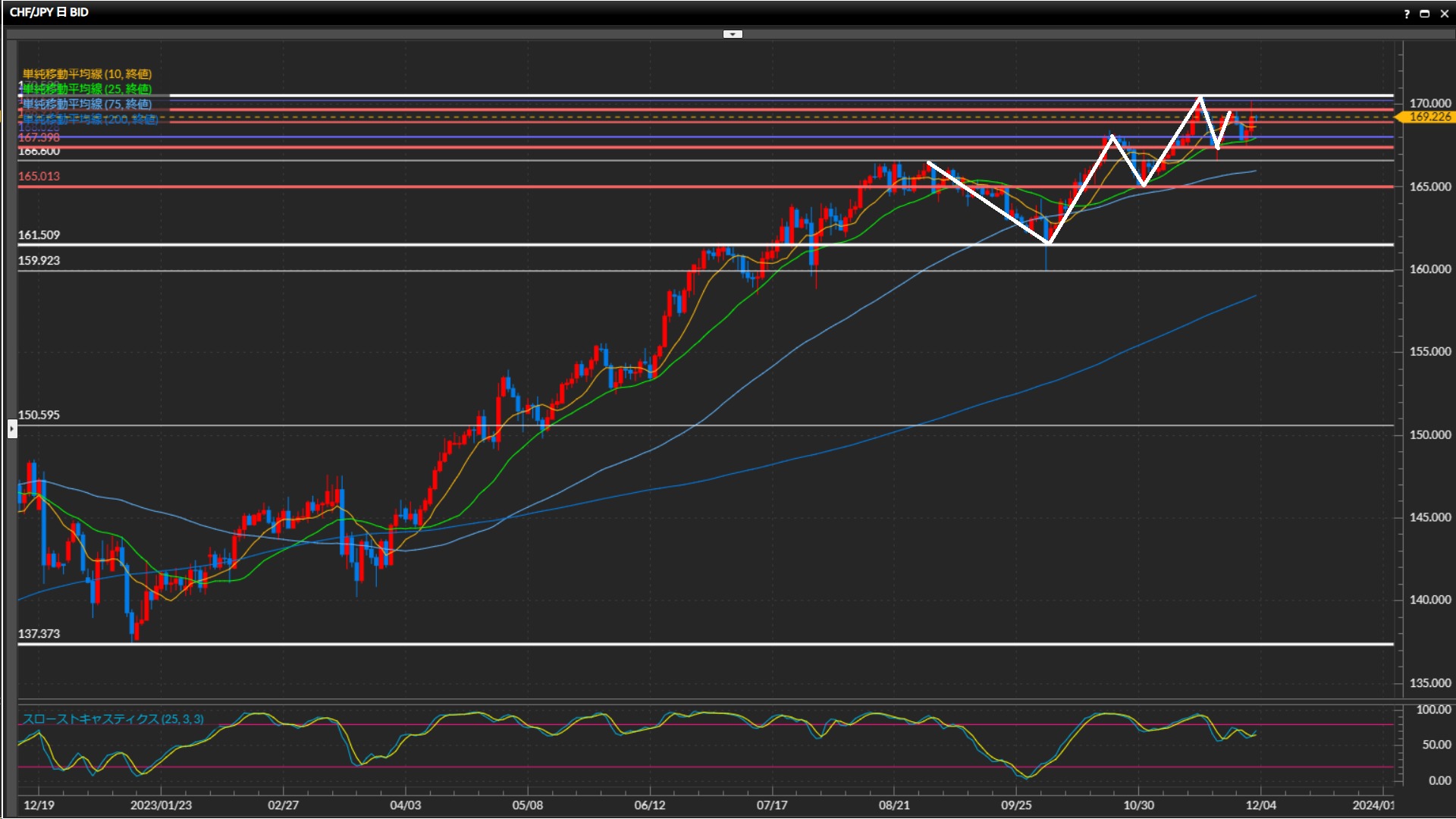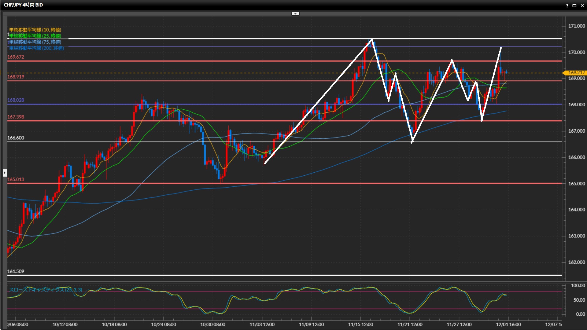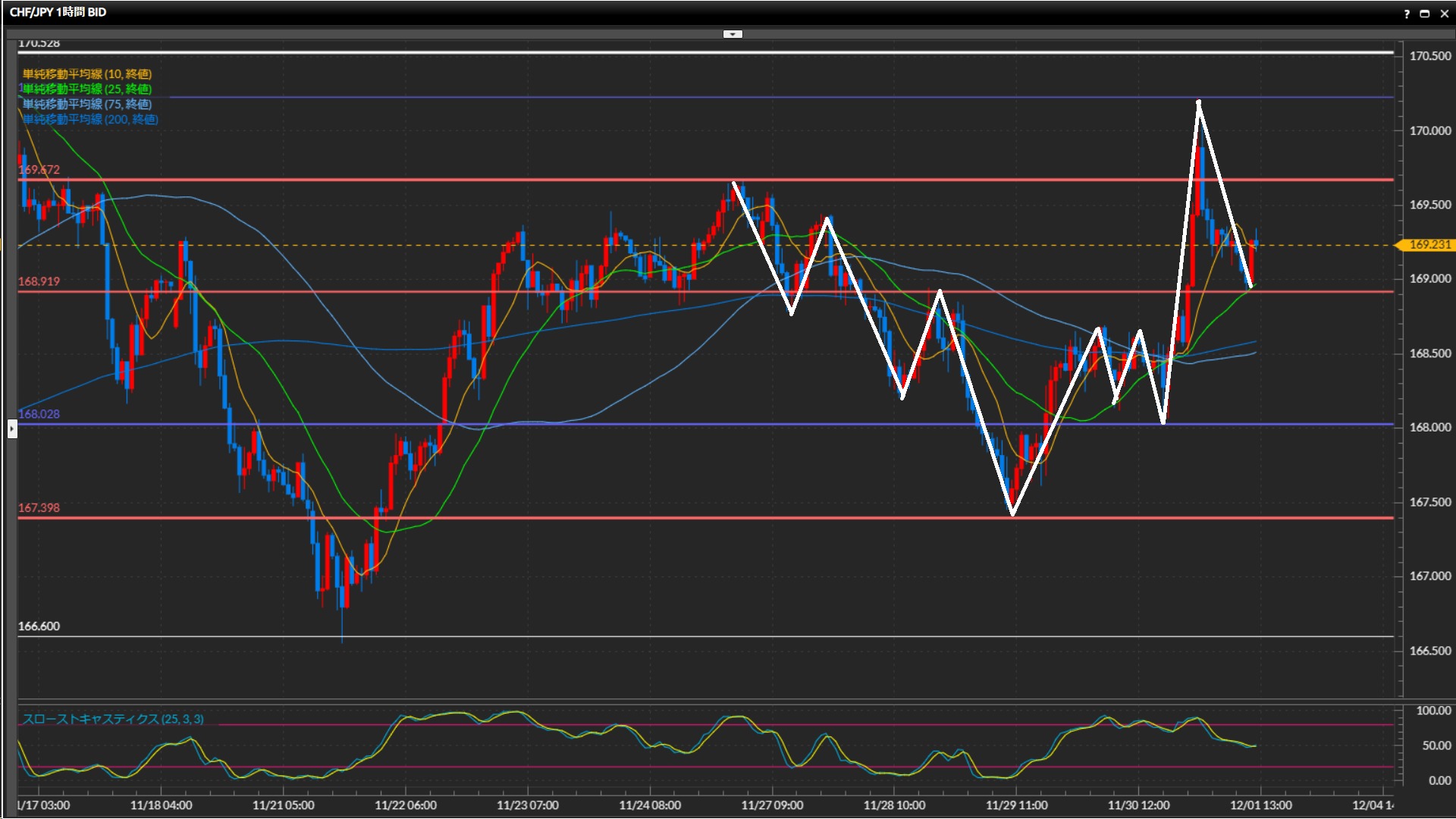 方向感が曖昧なのでトレードは見送り。本日の指標発表に注目。 - フラン円は日足は上目線、4時間足は下目線終了、1時間足は上目線。
