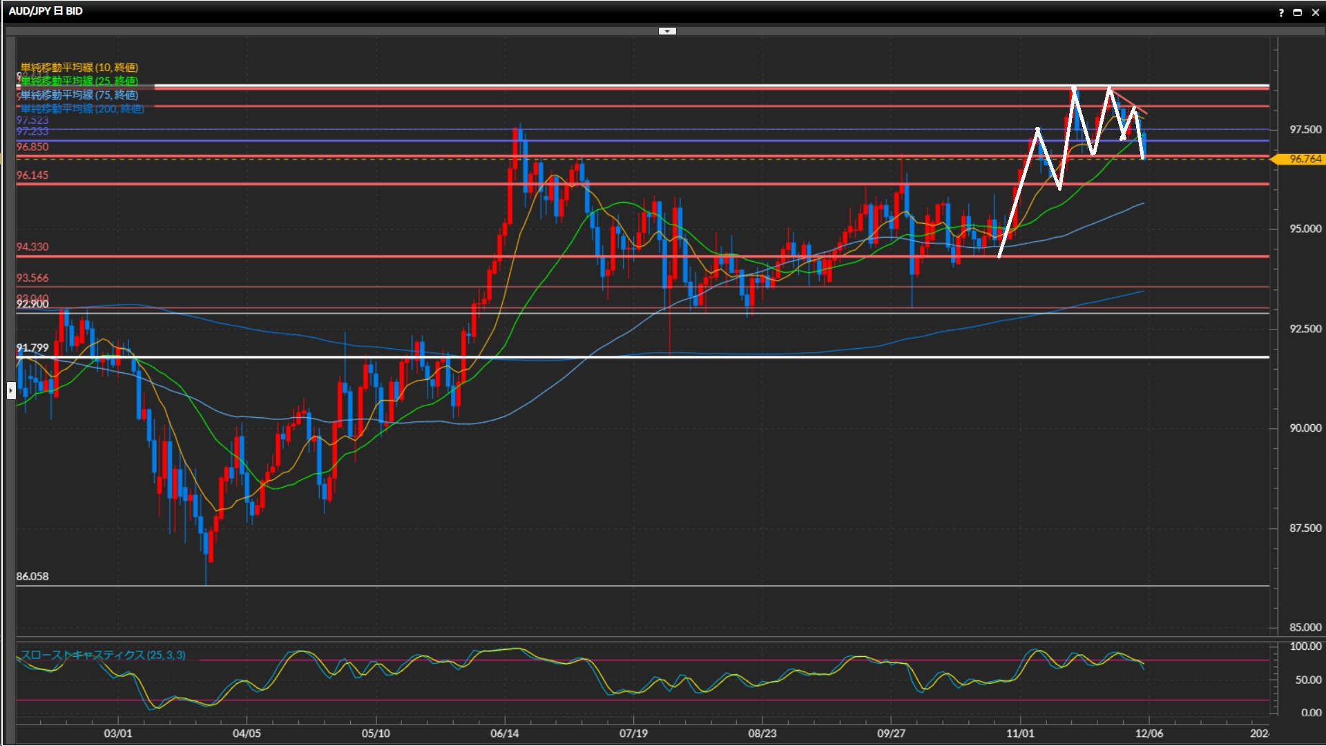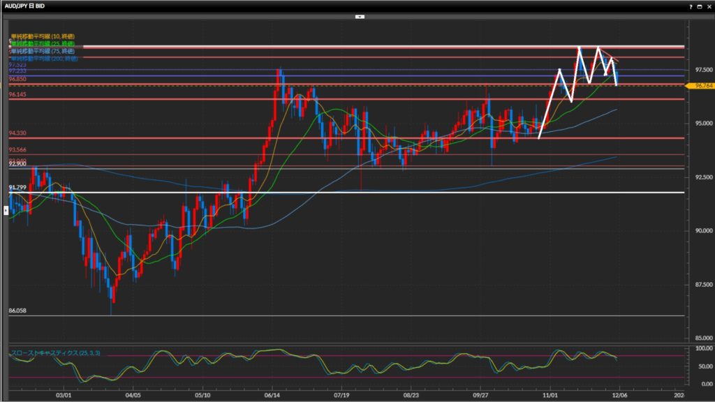 直近の高値は97.52円で、切り上げない限りは下目線。