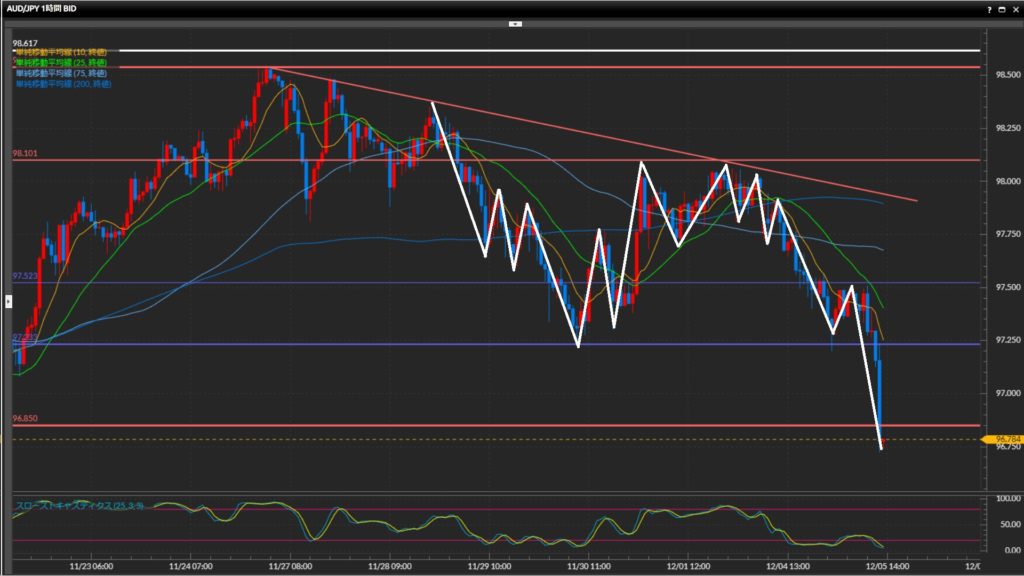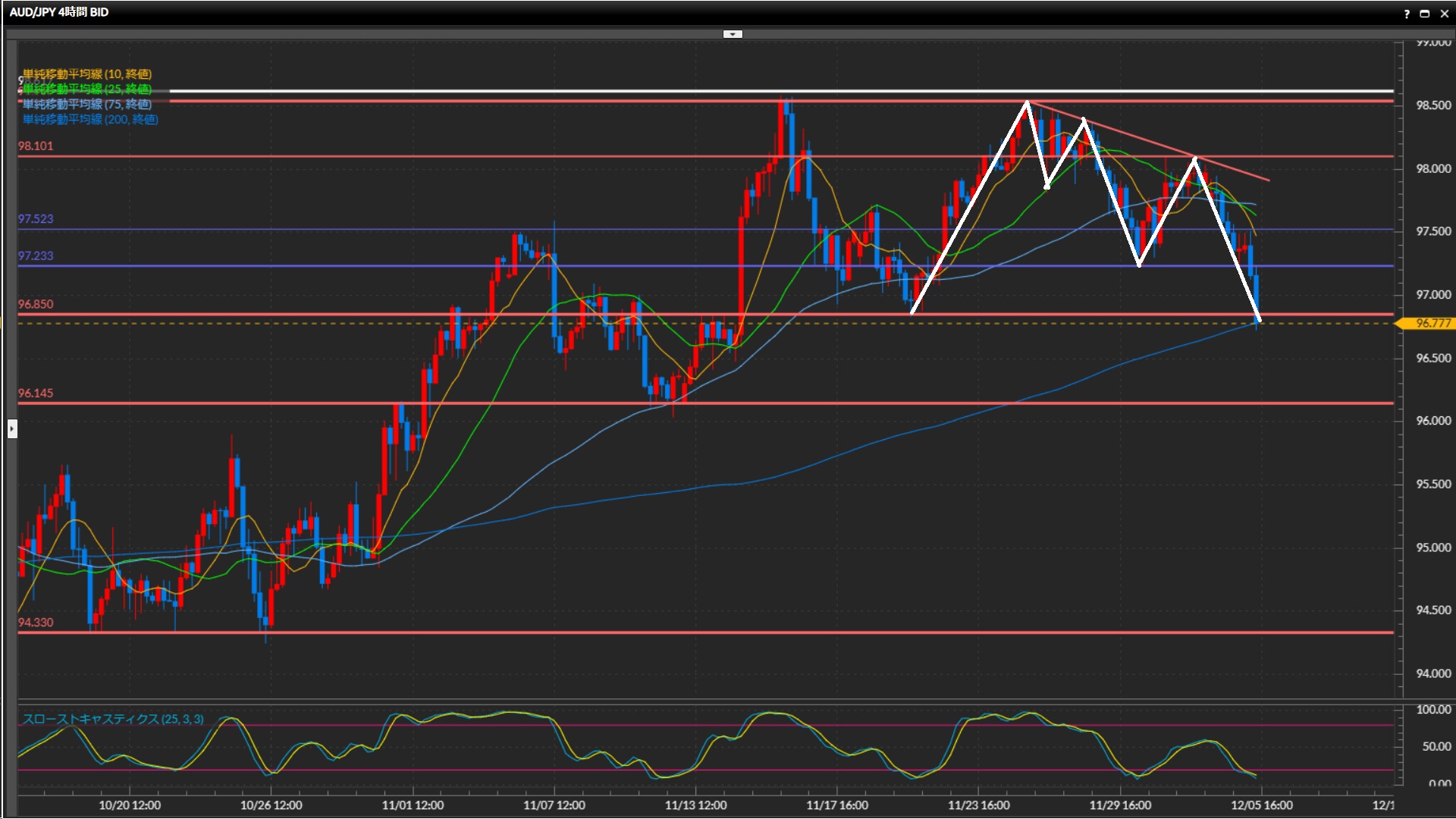本日の政策金利発表を契機に4時間足で上昇の起点になっていた96.85円を下抜け確定。