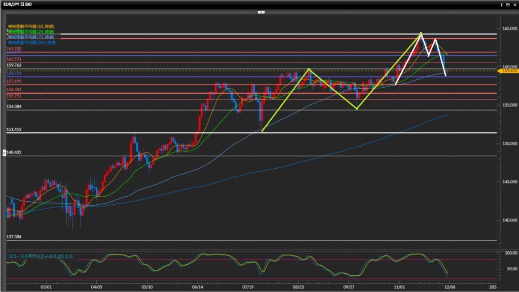 日足水平線159.76円を下抜け確定したものの、下落は止まっている。