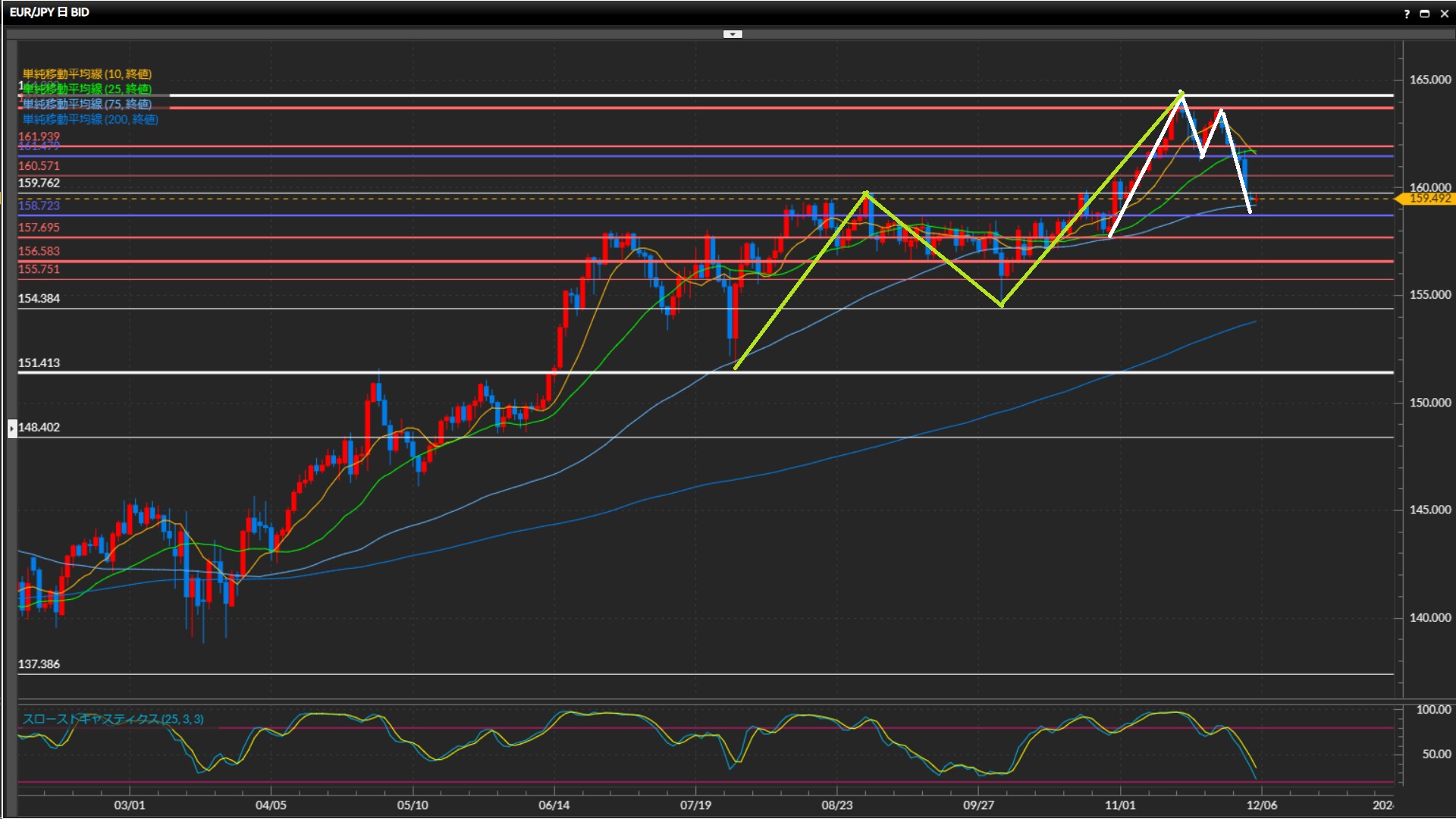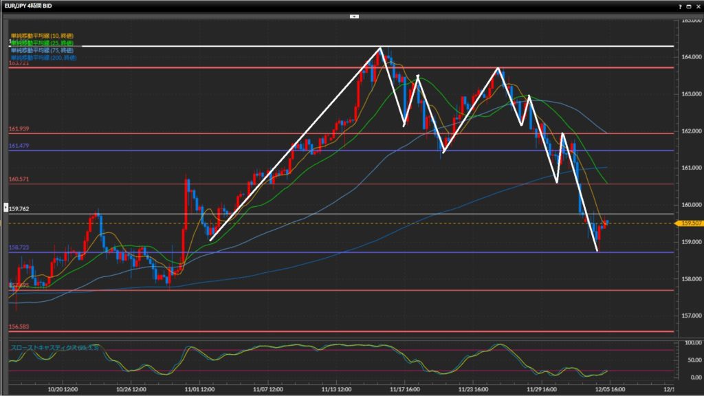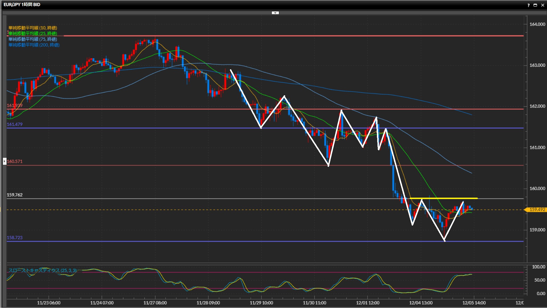 相場が大きく動く感じもないため、一旦トレード様子見。 - ユーロ円は日足〜1時間足で下目線。