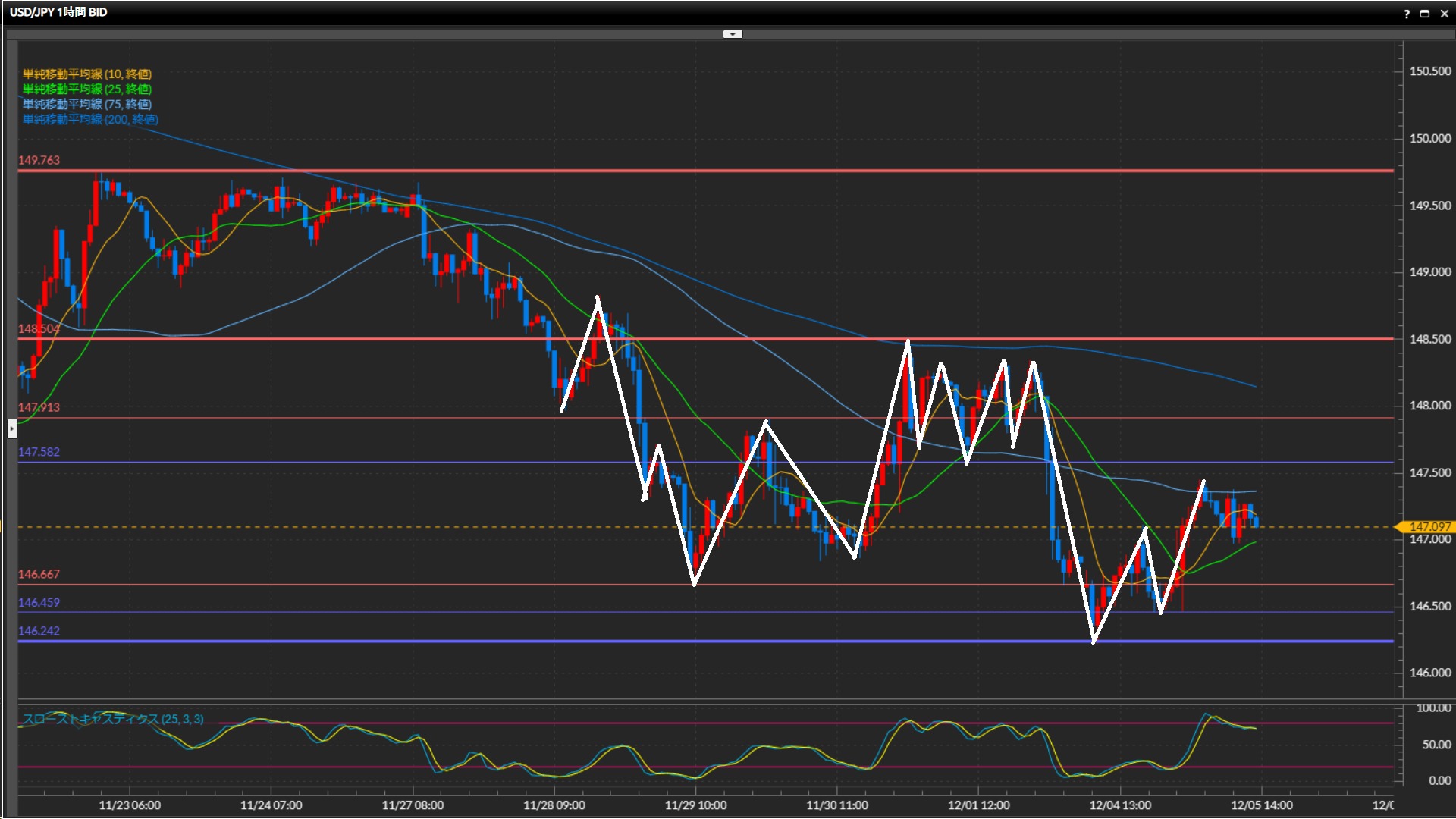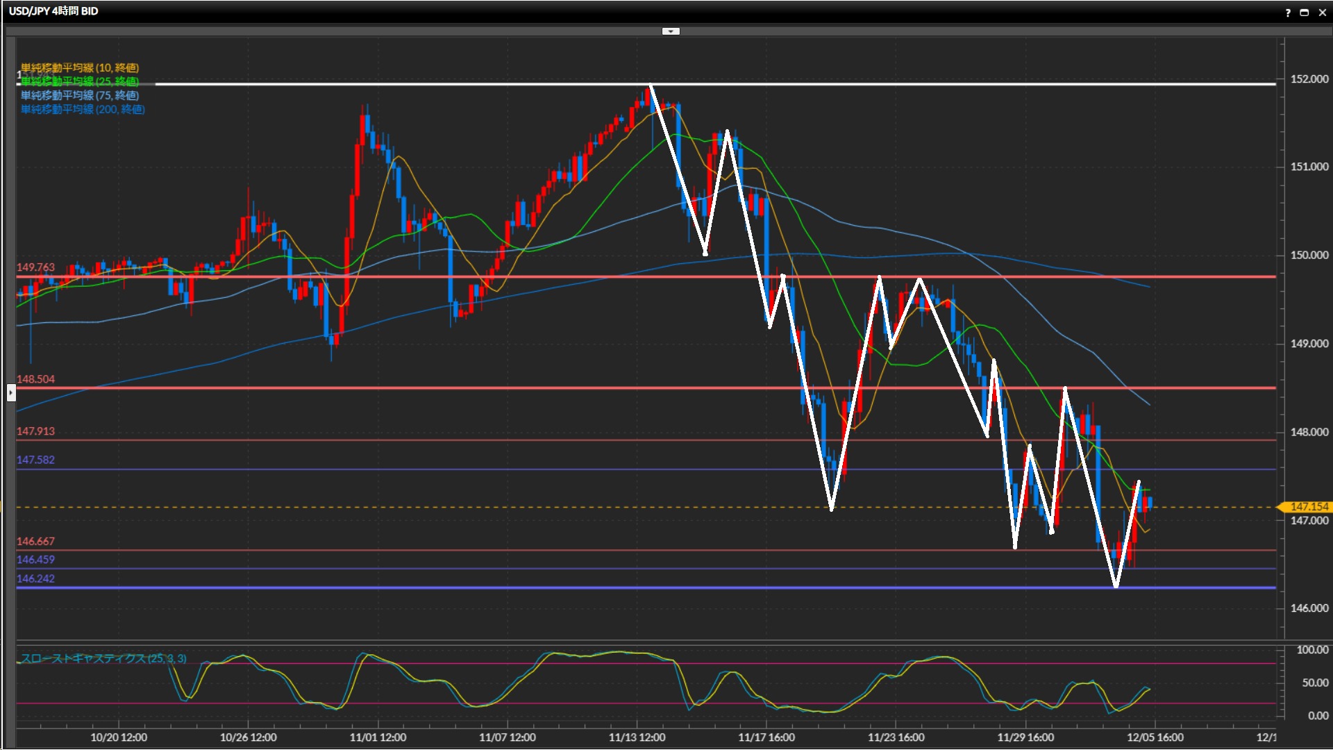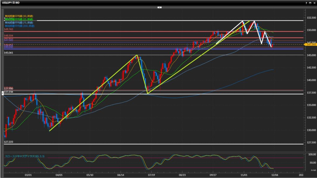 基本はショート狙いで、一旦日足水平線145.06円までが下値目標。