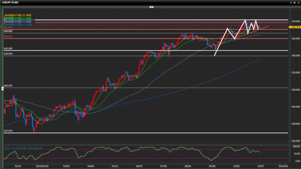 直近安値は168.92円で、下抜けない限りは上目線。