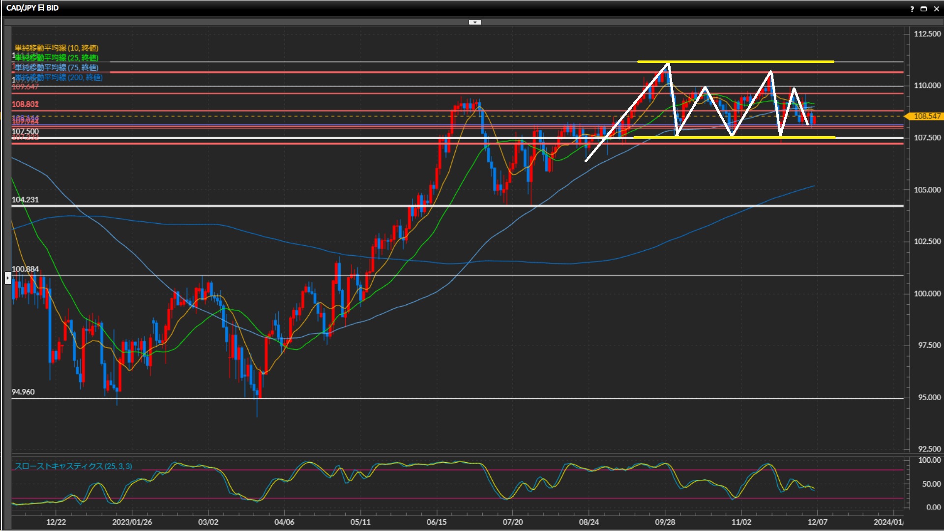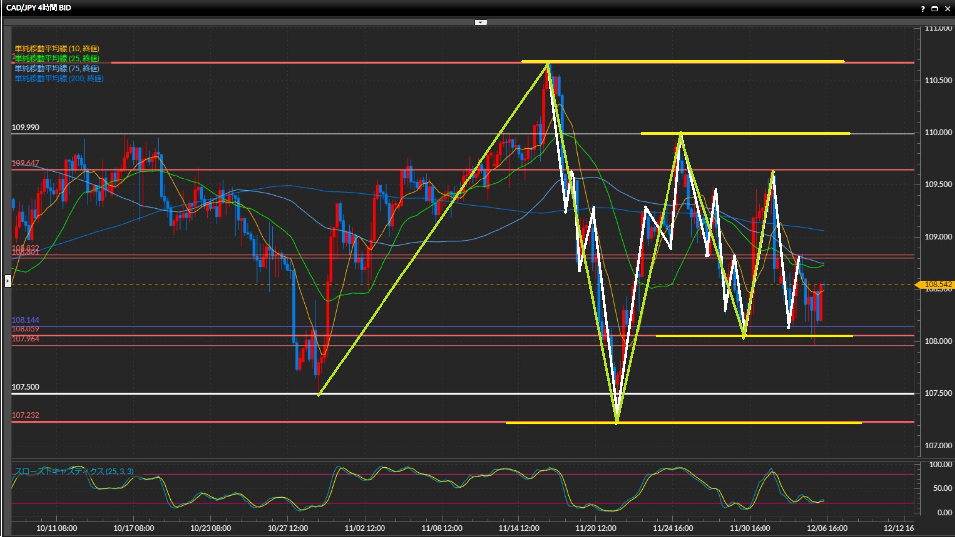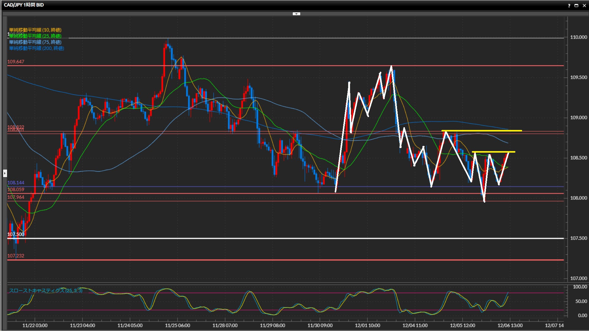 昨日は直近の下値108.06円をひげ足で下抜けたものの、実体はサポートされている。
