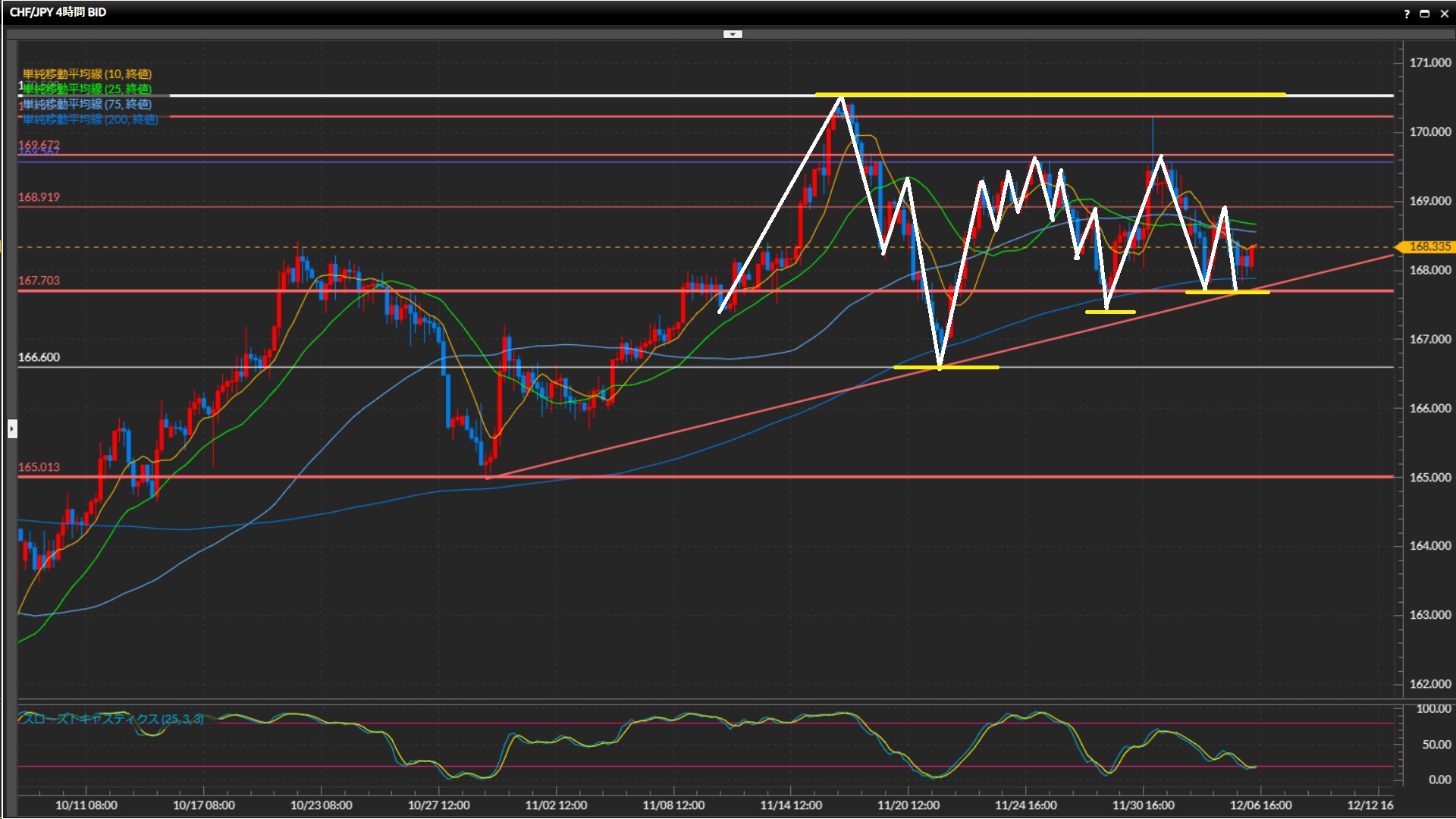 10月末の安値を起点とした上昇トレンドラインが通っており、ラインに沿って動いている訳ではないが安値切上げのパターンは継続中。