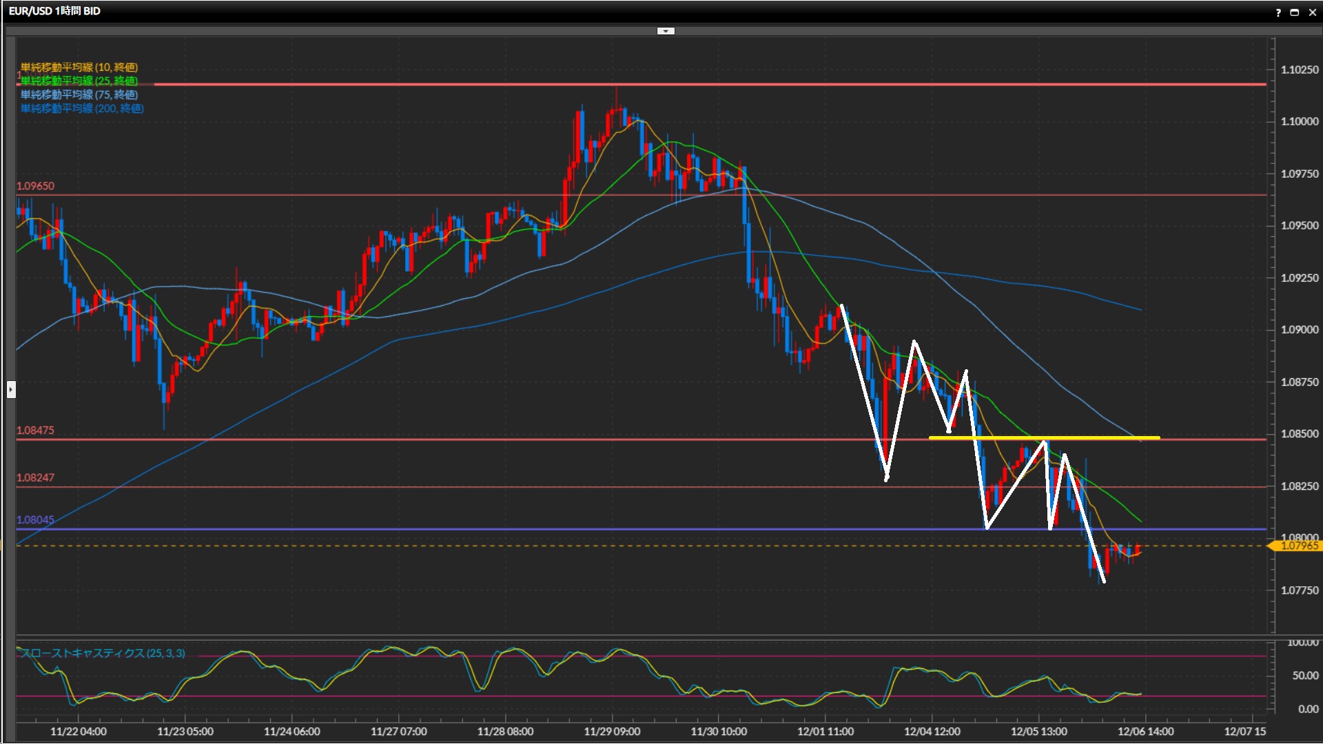直近の波で下値を支えていた水平線1.0805ドルを下抜け。さらに下落を狙いたい。