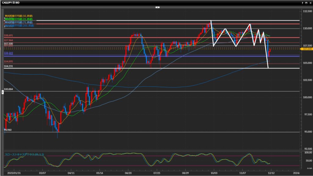 レンジの下値107.50円を下抜け後一気に日足水平線104.23円まで下落。