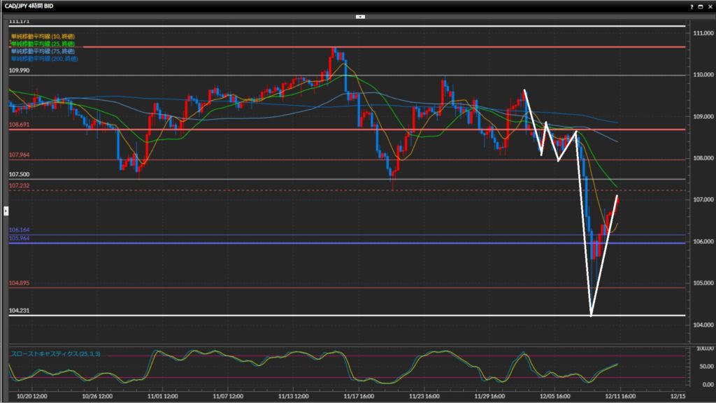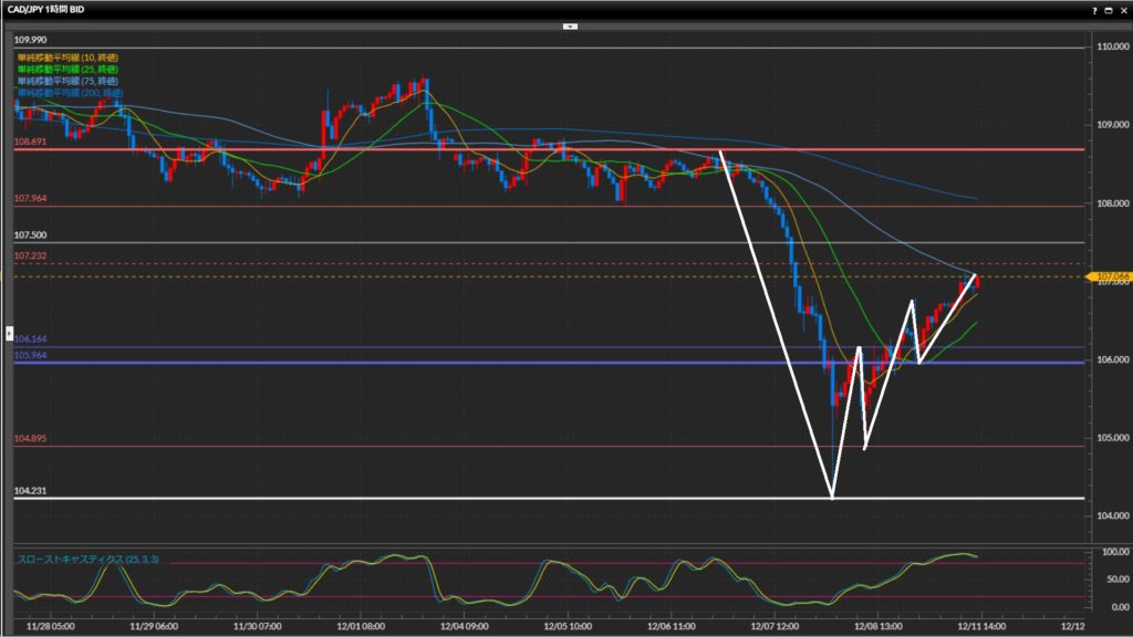 - 加ドル円は日足〜4時間足は下目線、1時間足は上目線。