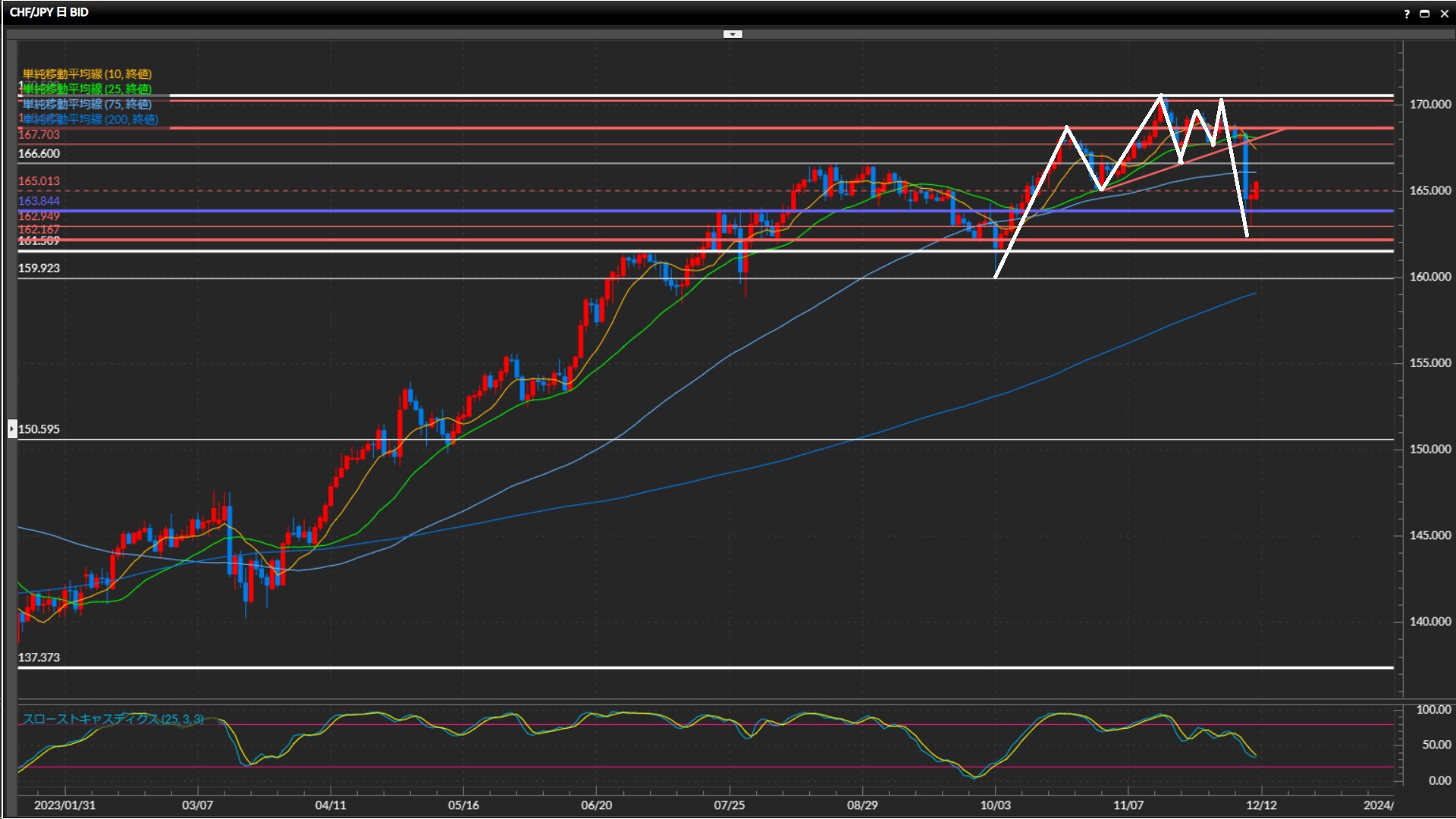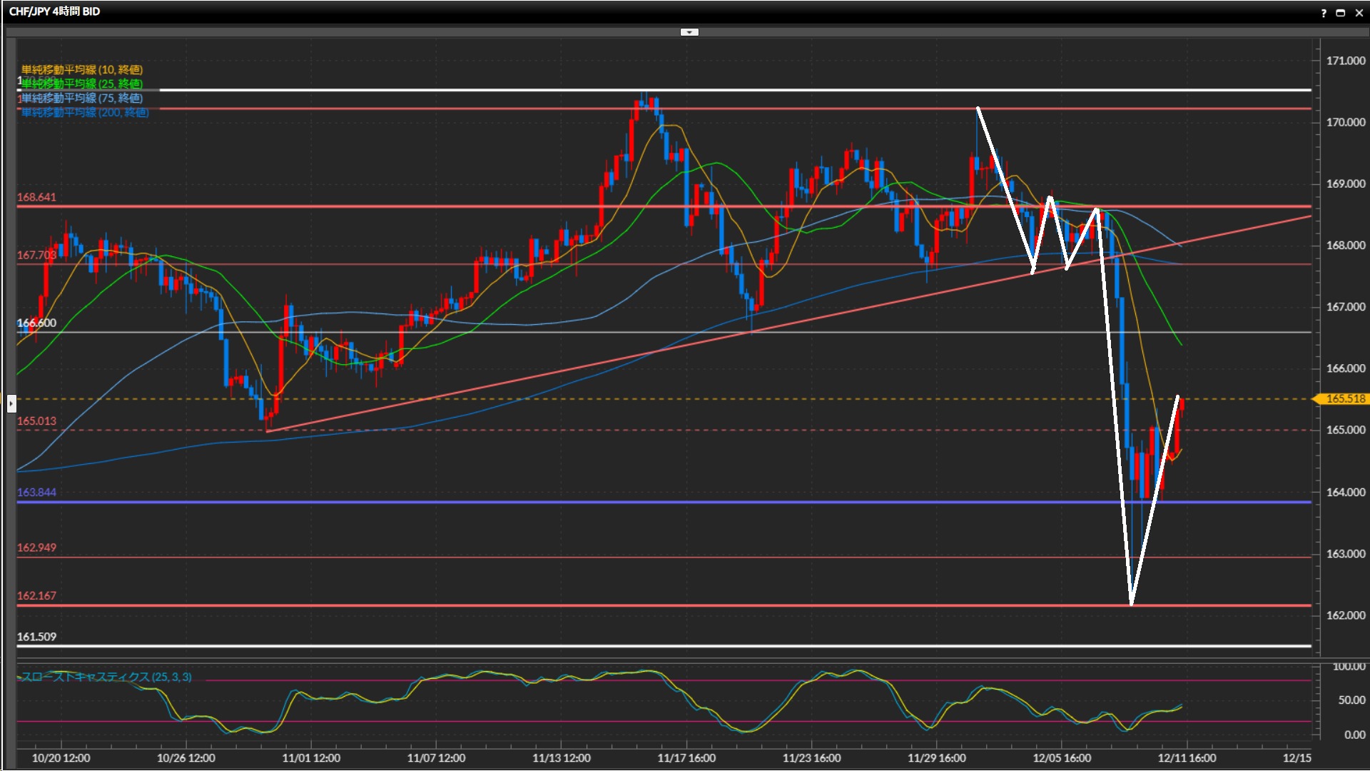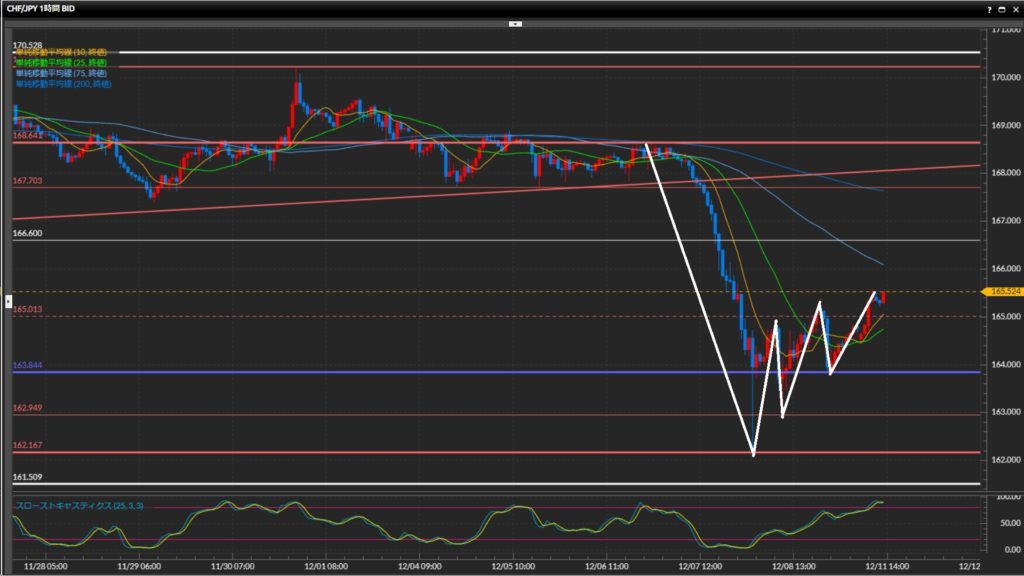 レジスタンスされて1時間足が下目線に転換したらショートを検討。 - フラン円は日足は上目線終了、4時間足は下目線、1時間足は上目線。
