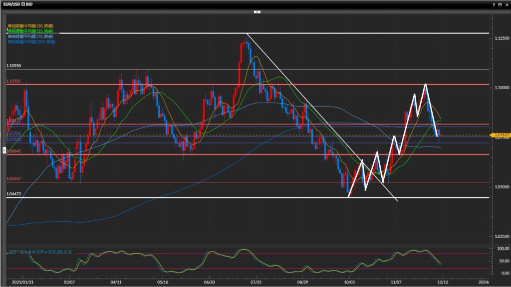 直近の高値は1.0818ドルで、25SMAが意識されて上値を抑えている。