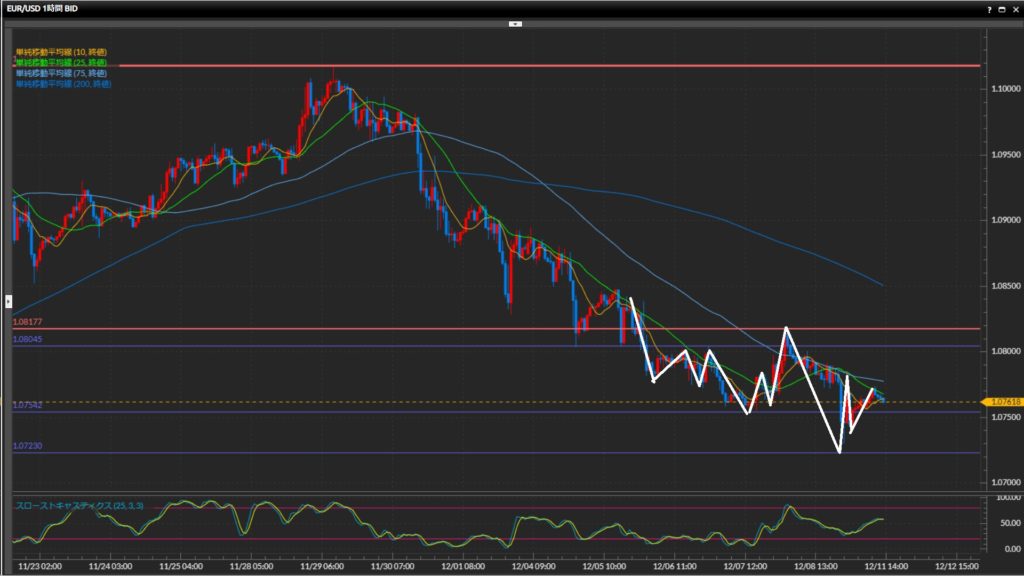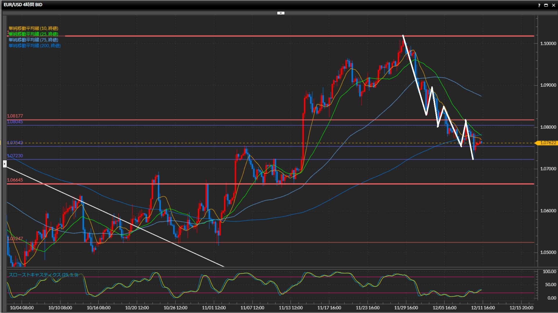 4時間足25SMAや1時間足75SMAなど、中長期の平均線で強く反発したら手仕舞い。 - ユーロドルは日足は上目線終了、4時間足は下目線、1時間足は下目線終了。