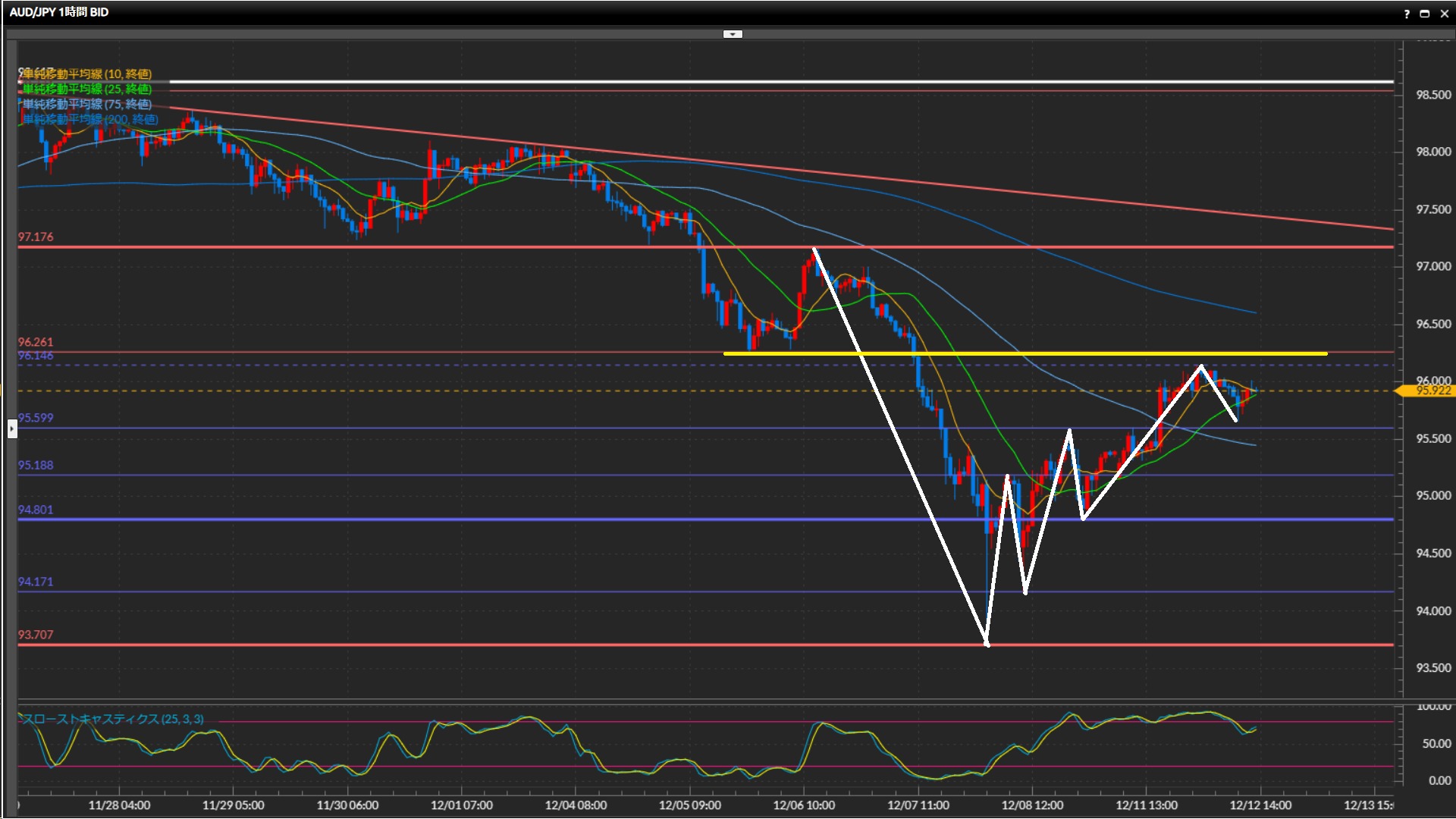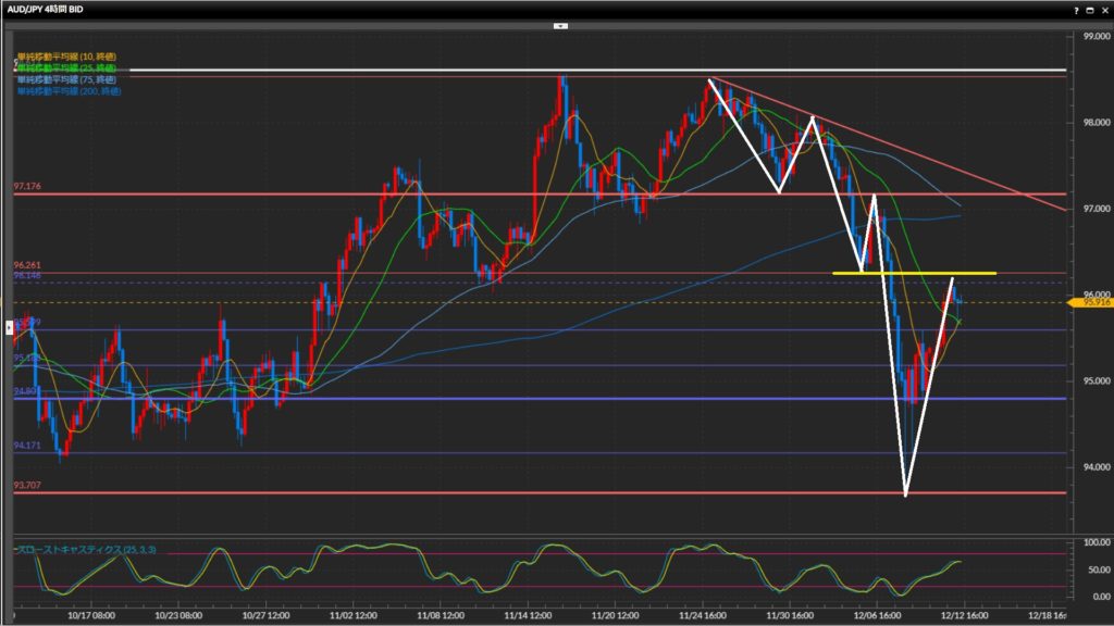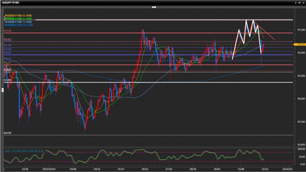 足元は下落が若干強めなものの、1時間足がダウで目線転換するまでショートしない。 - 豪ドル円は日足〜4時間足は下目線、1時間足は上目線。