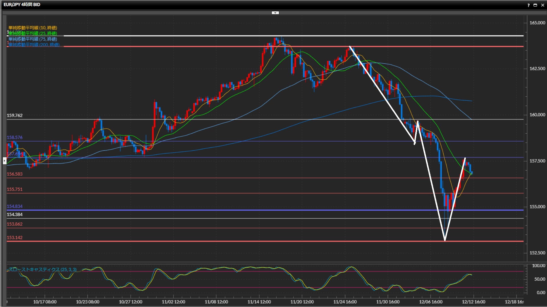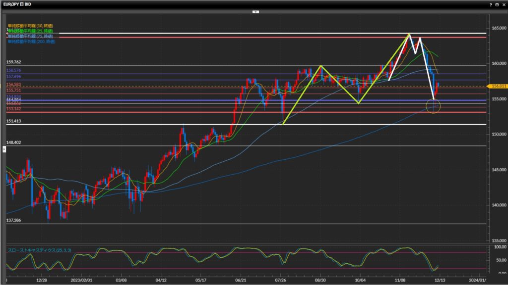 ひげ足では大きな流れで波の安値を作った154.38円や、200SMAを下抜け。