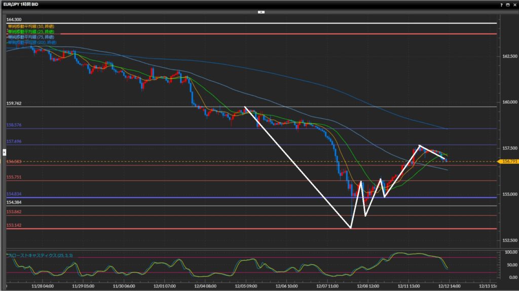 1時間足が高値安値を切下げ下目線へ転換したら、ショートを検討。 - ユーロ円は日足〜4時間足は下目線、1時間足は上目線。