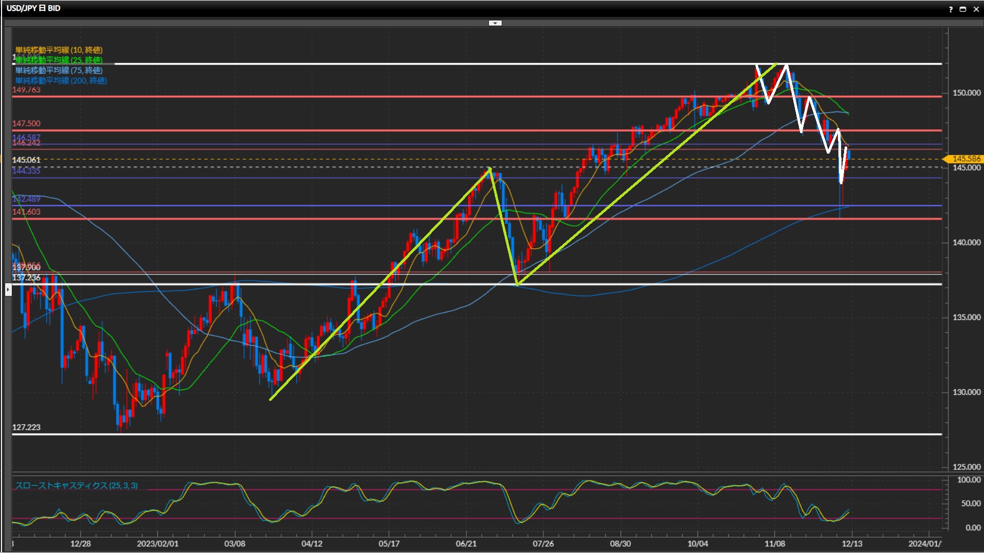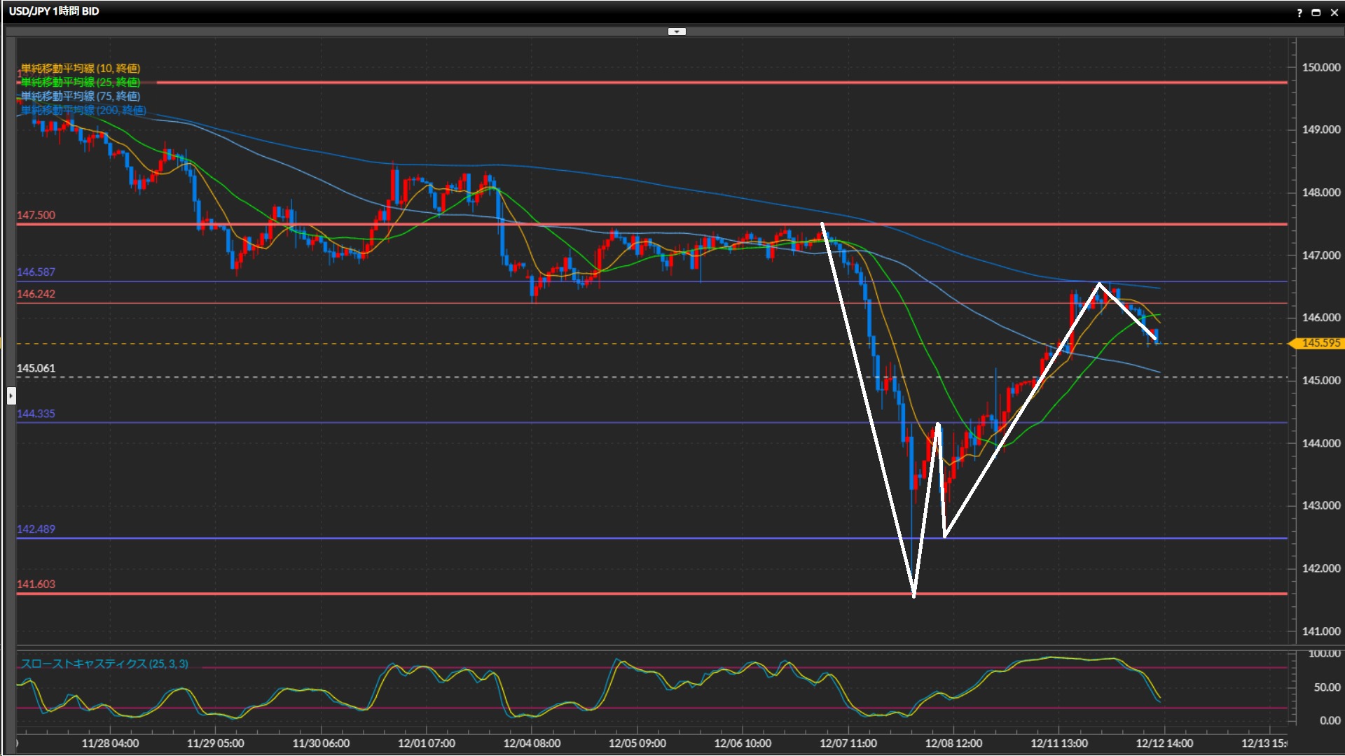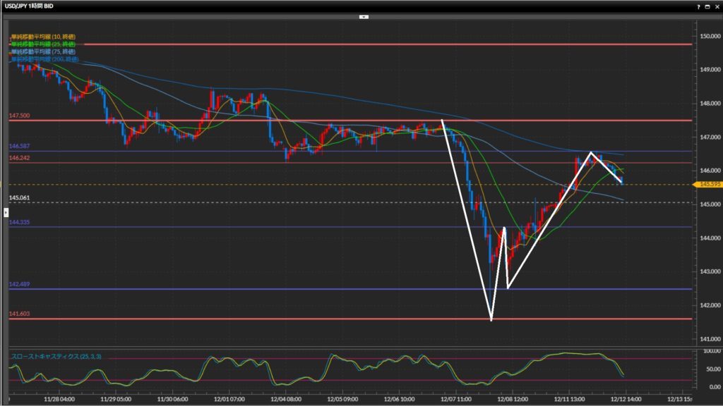 昨日146.59円まで高値をつけた後は上げ止まり、25SMAを割って下落中。