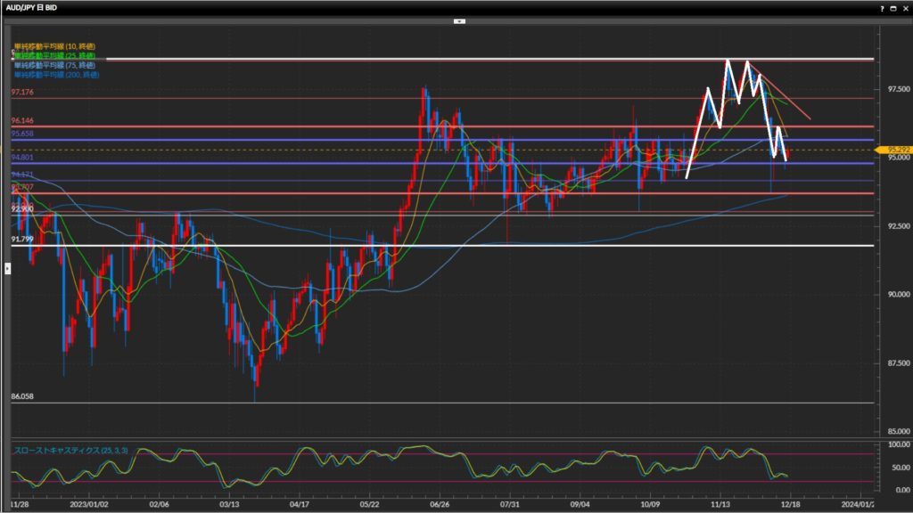 ひげ足を考慮すると安値切上げで、実体での判断では94.80円を下値と捉えたレンジ。