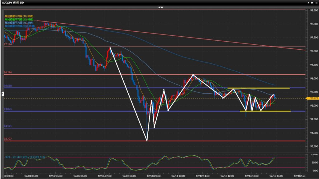 1時間足水平線94.80円が何度も意識されているため、小さな波でレンジ状態と捉える。