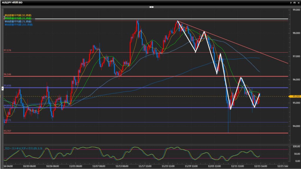 4時間足以下では三角保合になっているため、本日はレンジ内の上下を狙いたい。 - 豪ドル円は日足は下目線、4時間足〜1時間足はレンジ。
