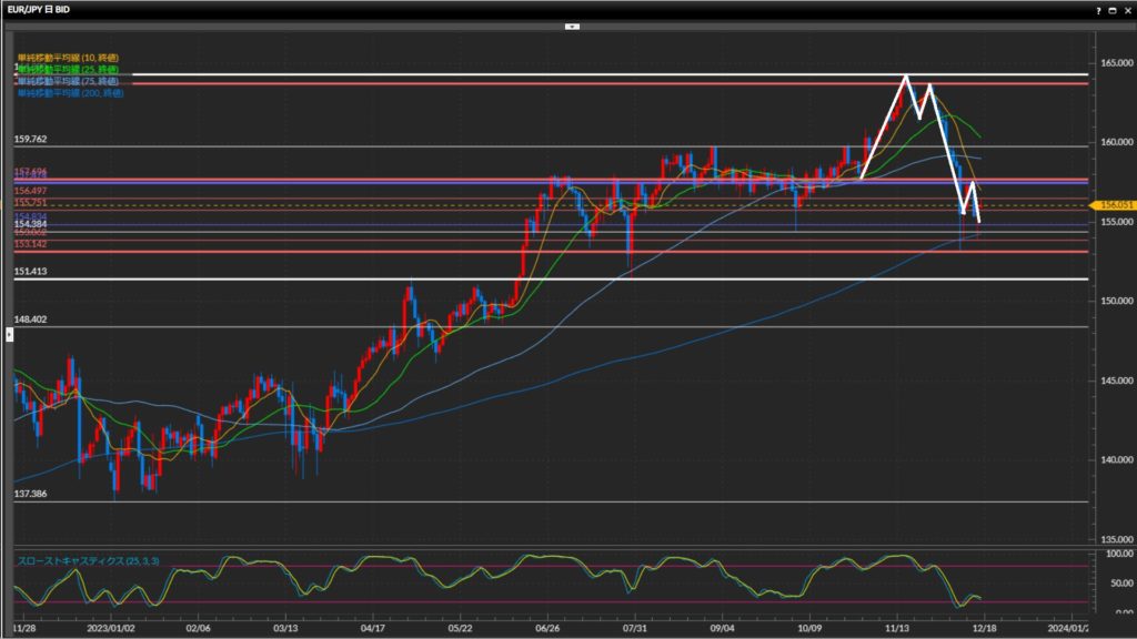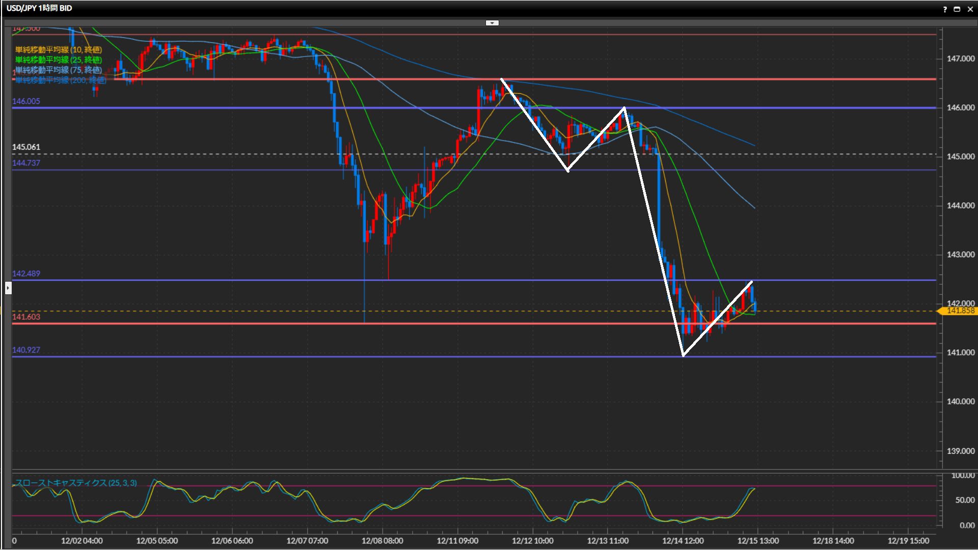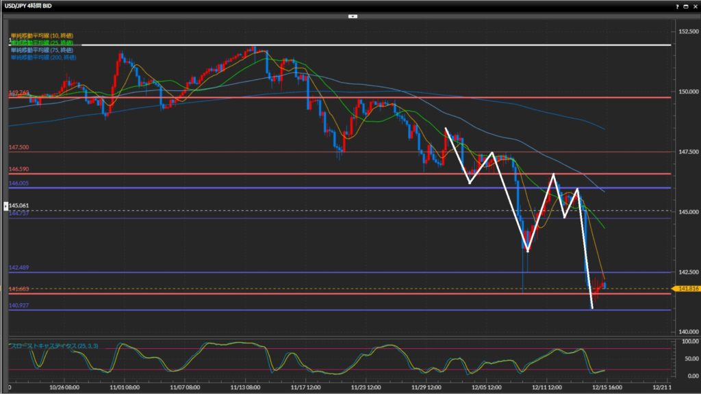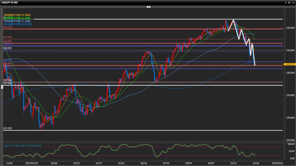 下落の勢いで75SMAを下抜け確定。200SMAの前で一旦下げ止まり。