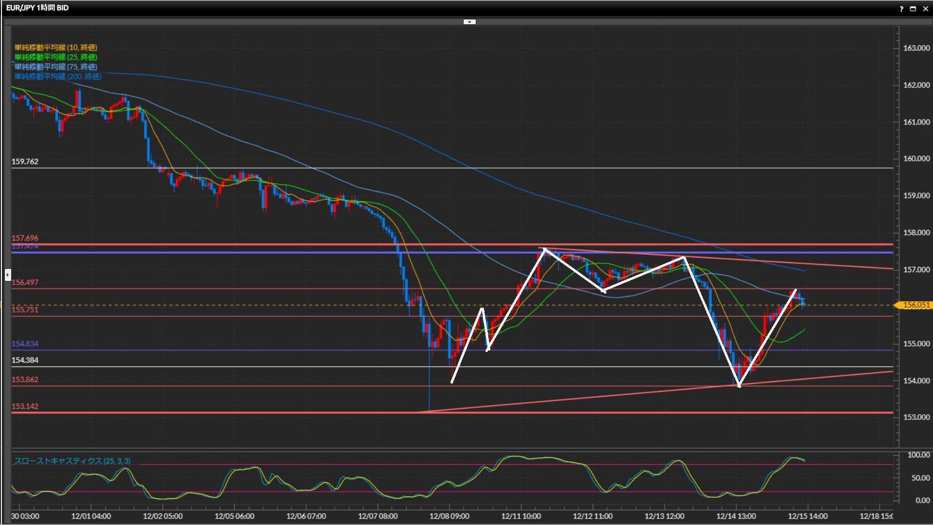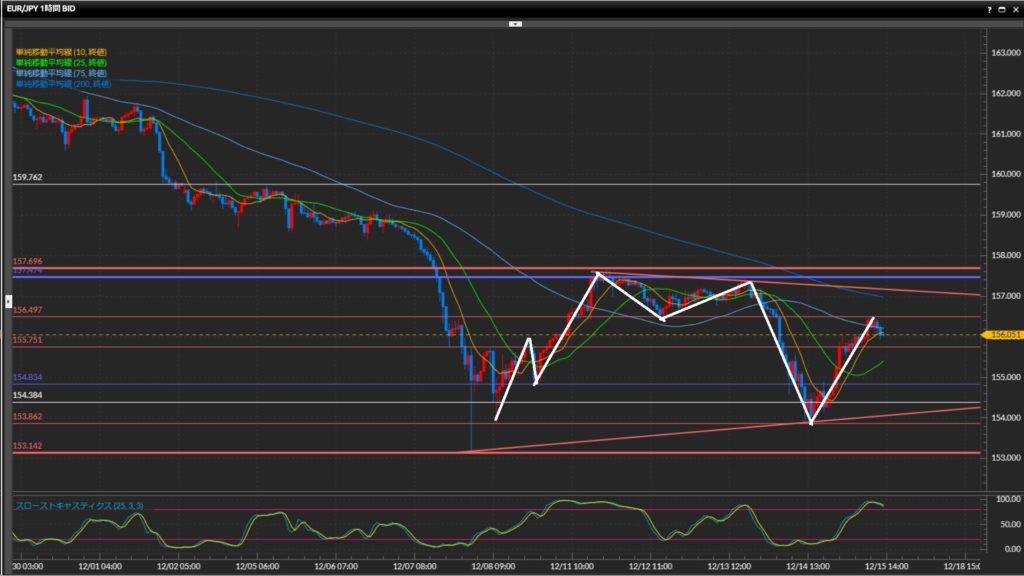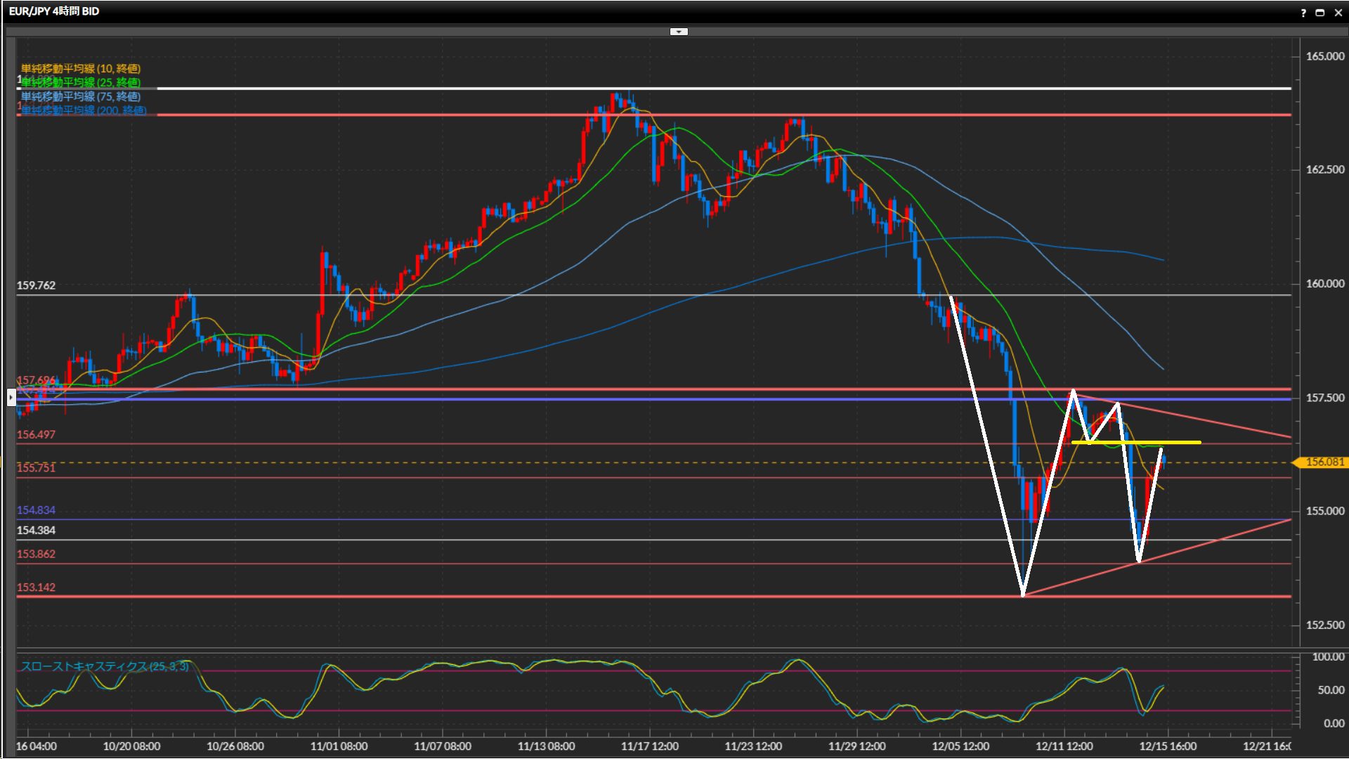 直近の波では4時間足水平線156.50円が意識されている様子。