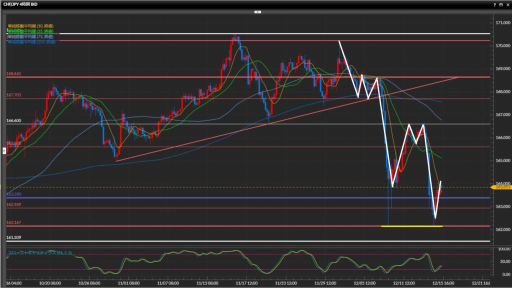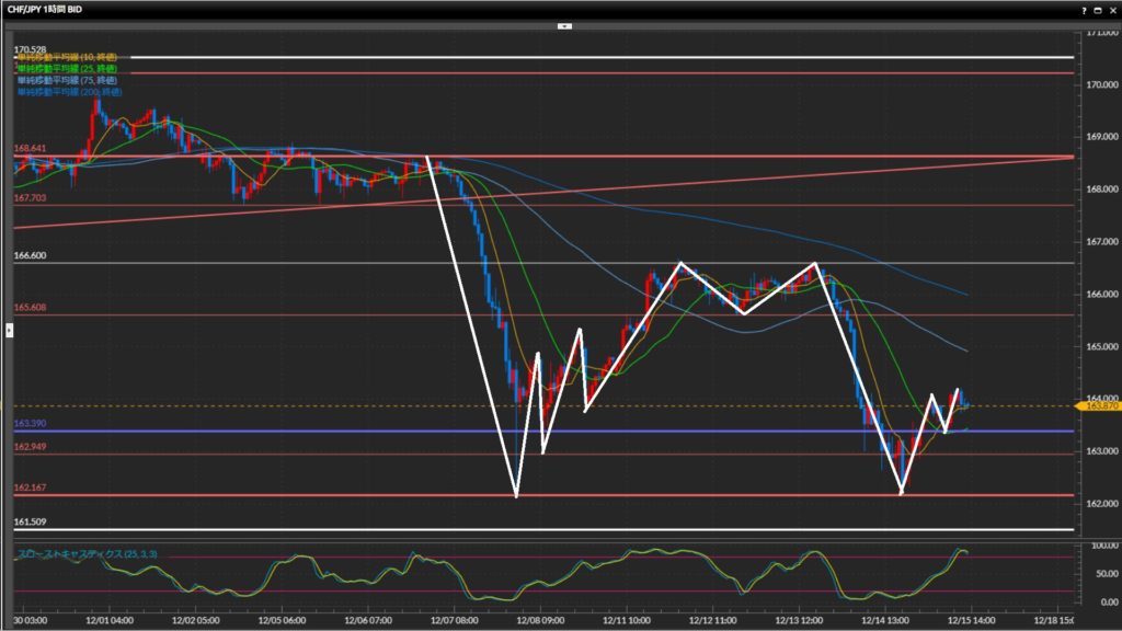 日足200SMAを跨いで上下しており、本日のローソクがどこで確定するか注目。 - フラン円は日足〜4時間足は下目線、1時間足は上目線。