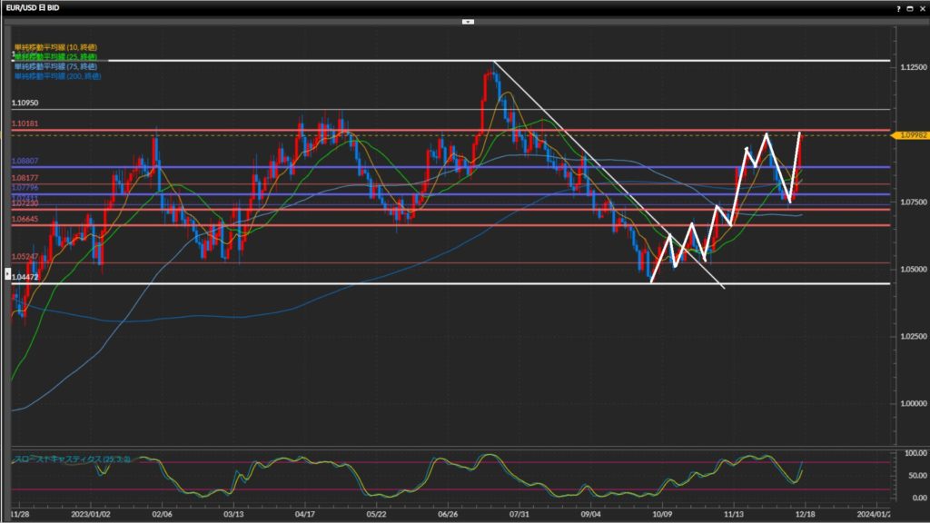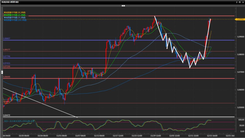 上昇の勢いが強く、直近安値1.0780ドルから最高値1.1018ドルまで一気に到達。