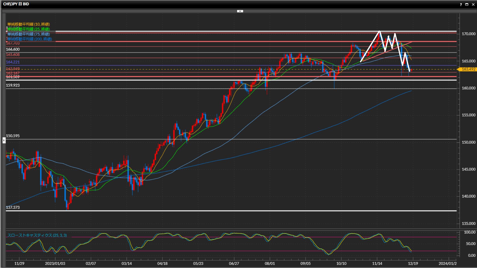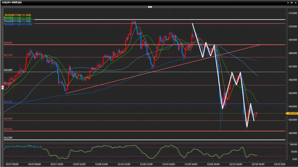 • フラン円日足は下目線4時間足〜1時間足はレンジ