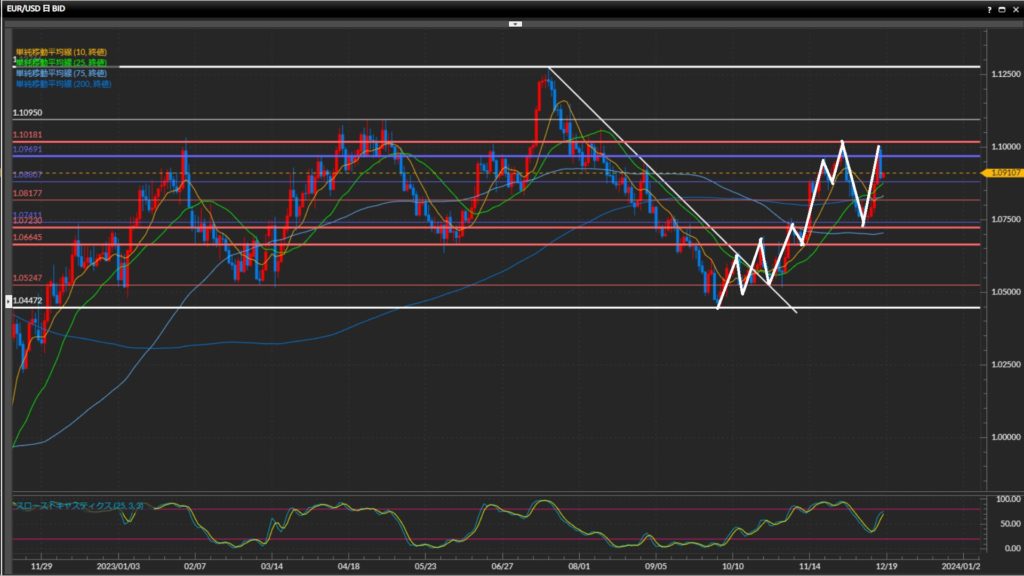 先週末は水平線1.1018円が意識されて下落したものの、4時間足ではロング狙い継続。