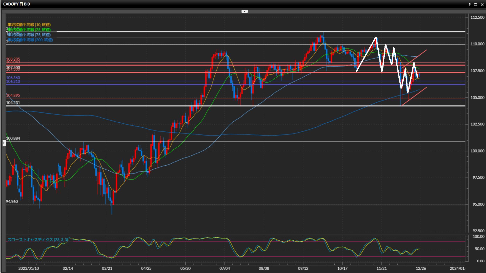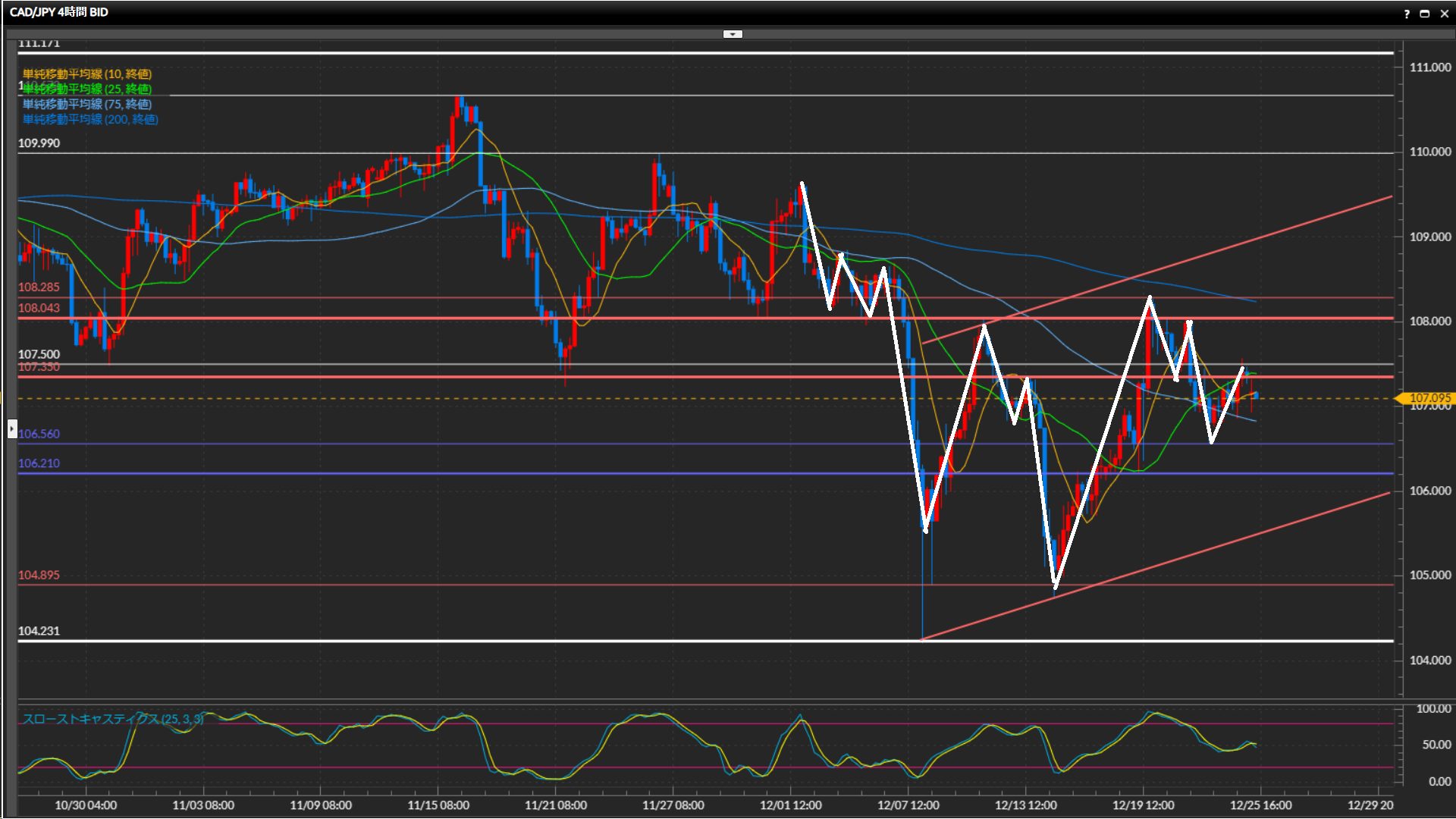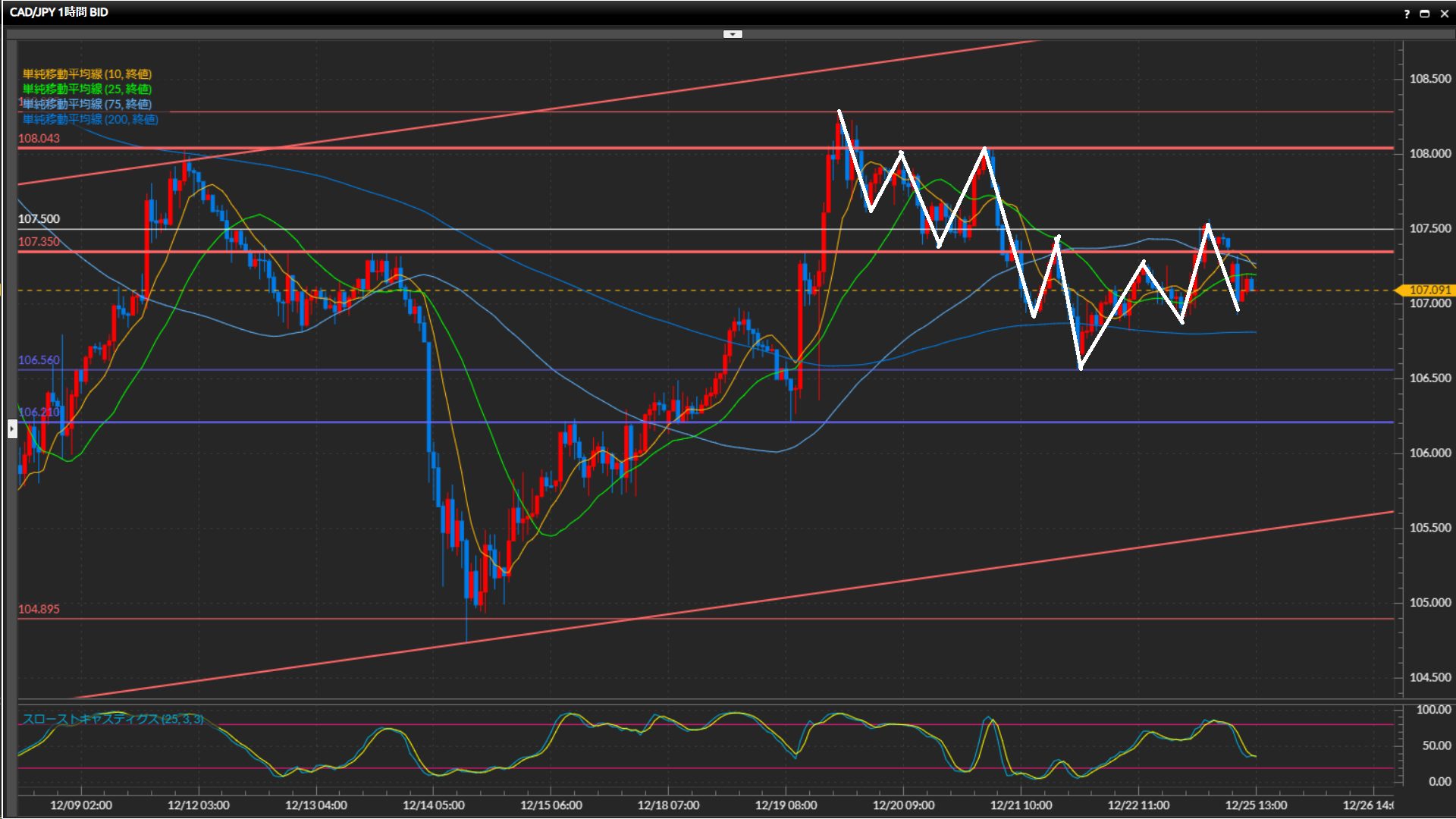 - 加ドル円は日足は下目線終了、4時間足は下目線、1時間足は上目線。