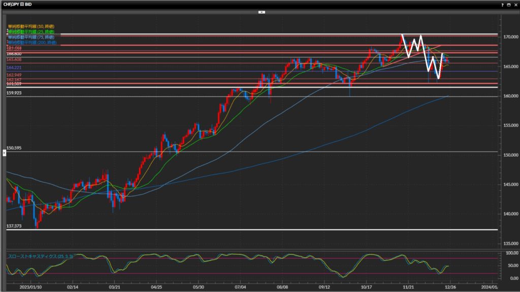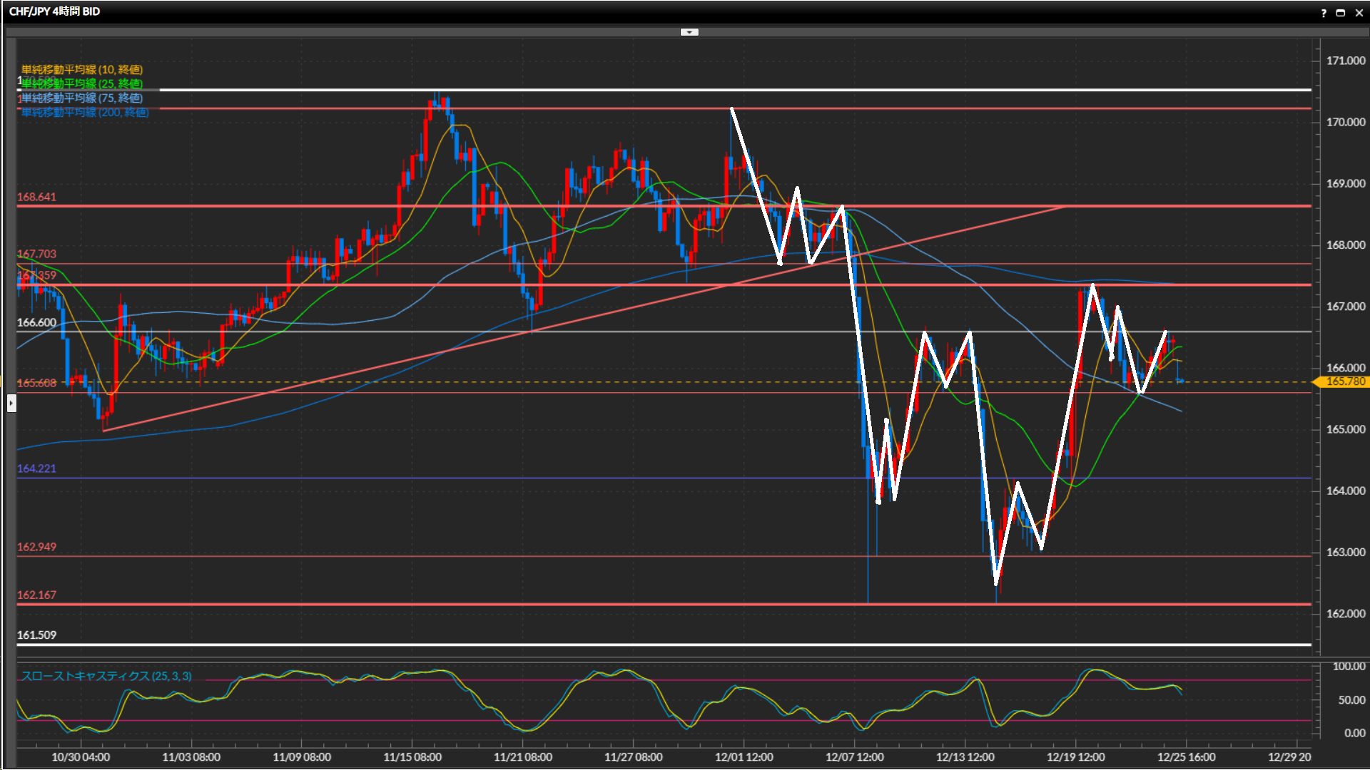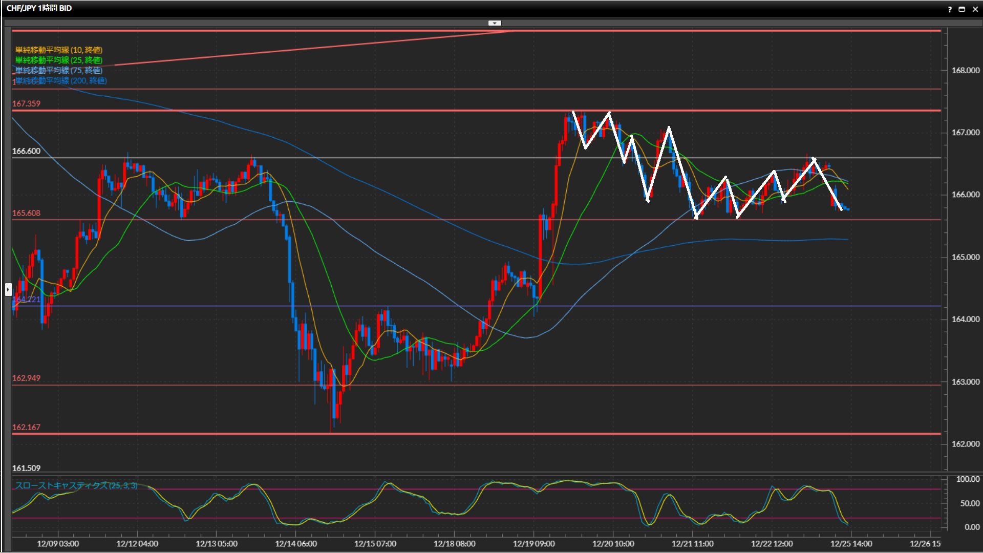 - フラン円は日足は下目線終了、4時間足は下目線、1時間足は上目線終了。