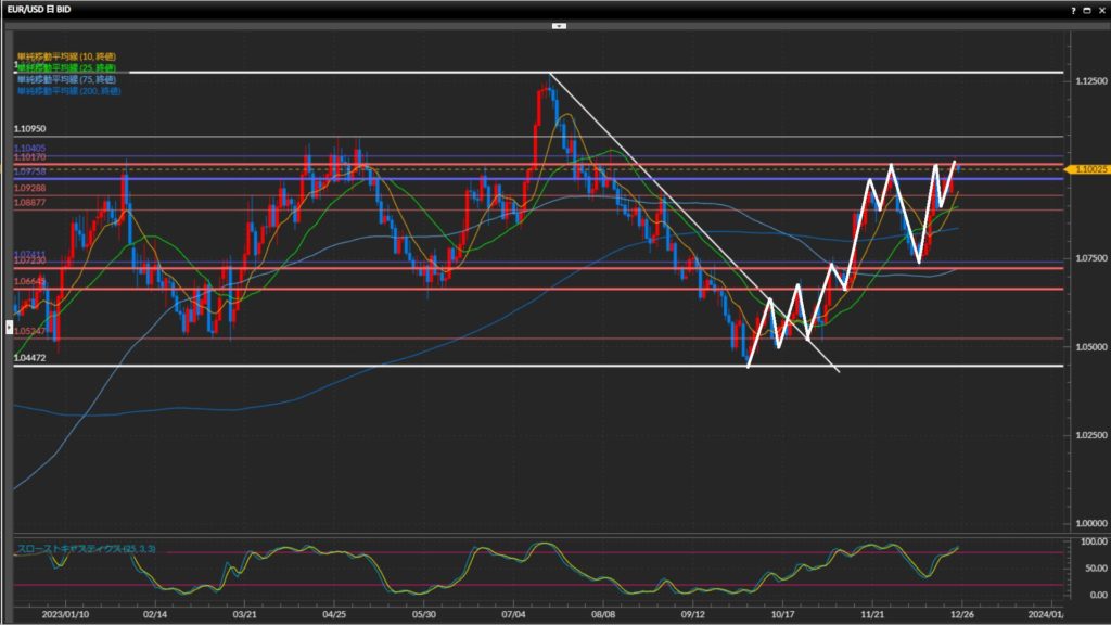 日足水平線1.1095ドル付近まで上昇する想定で買いで仕掛けたい所。