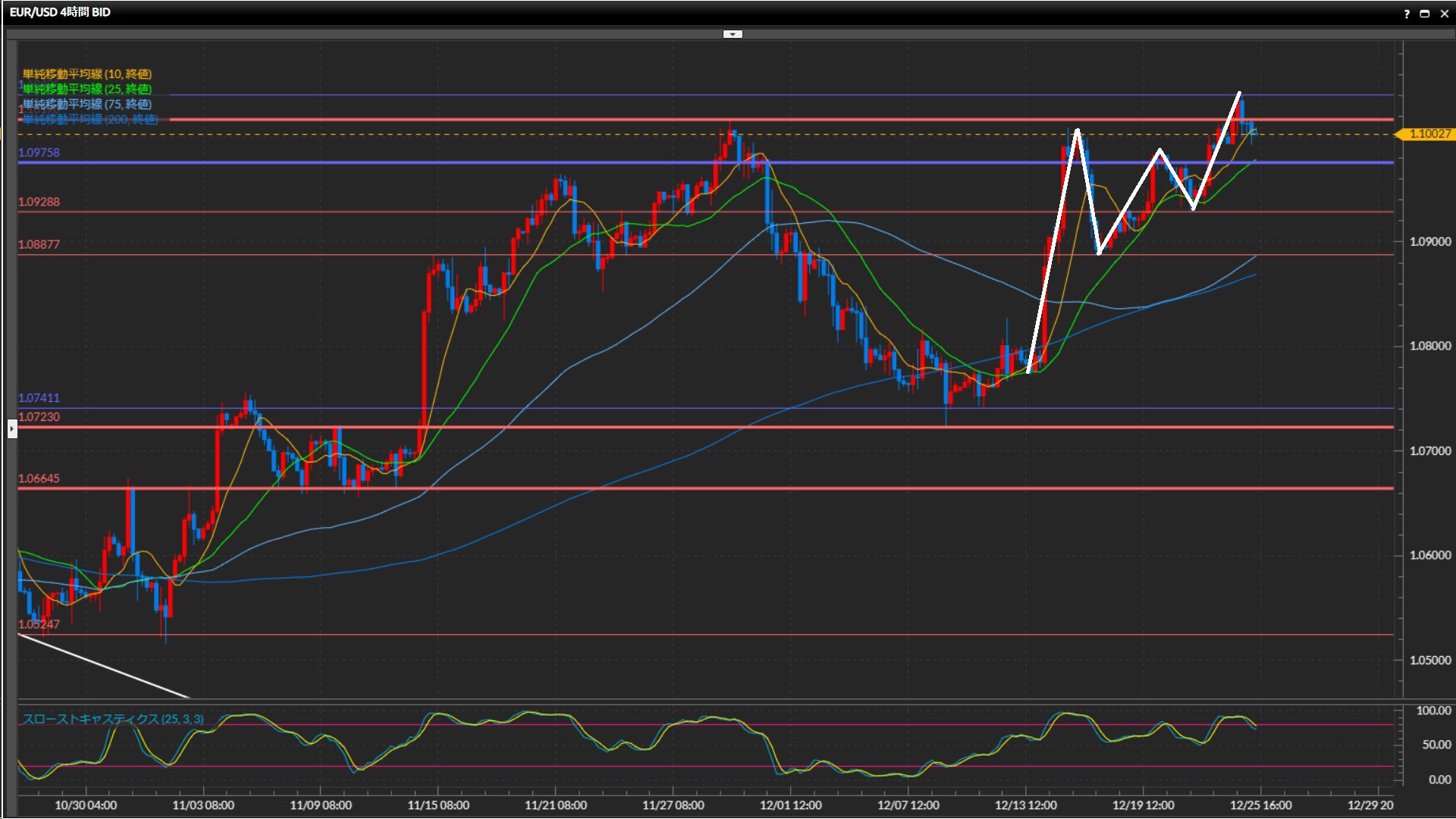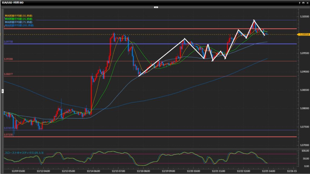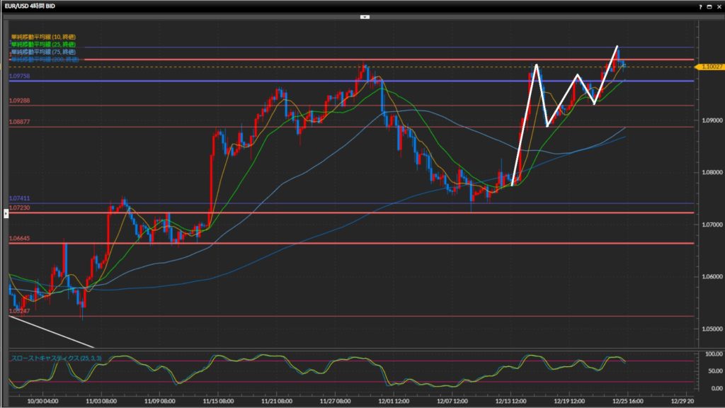 - ユーロドルは日足は上目線終了、4時間足〜1時間足は上目線。