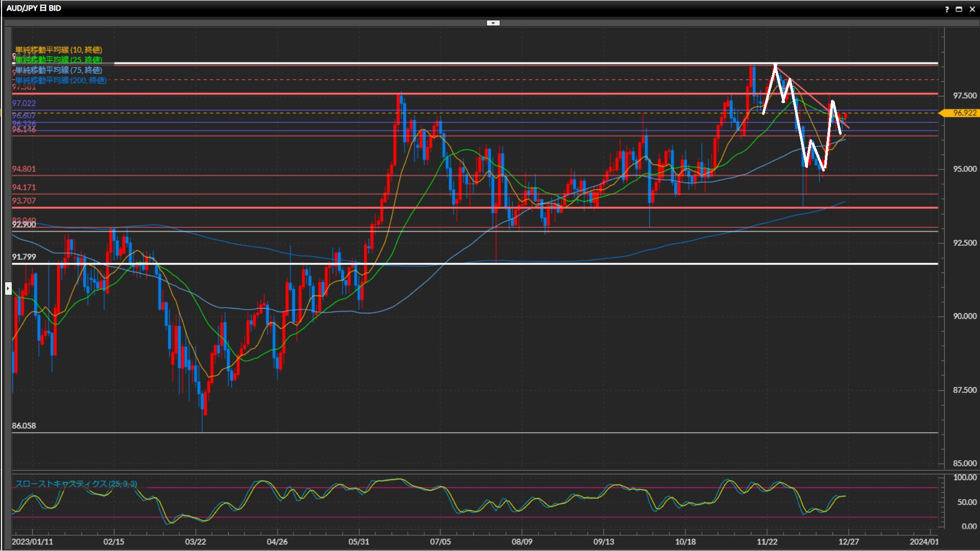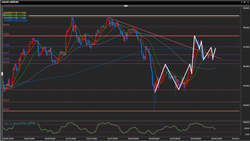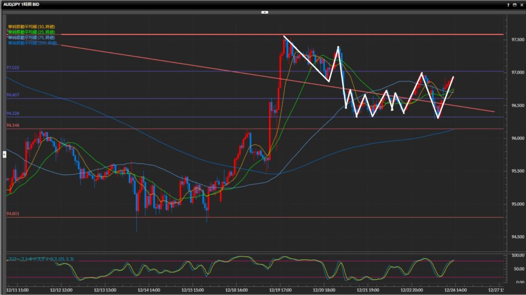 相場参加者も少ないため基本的には様子見。 - 豪ドル円は日足は下目線終了、4時間足〜1時間足はレンジ。