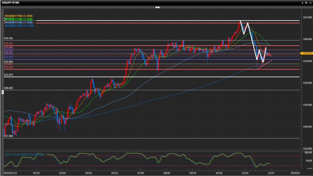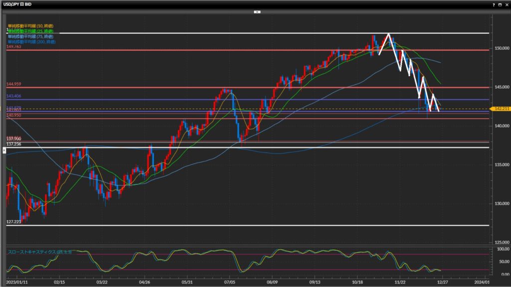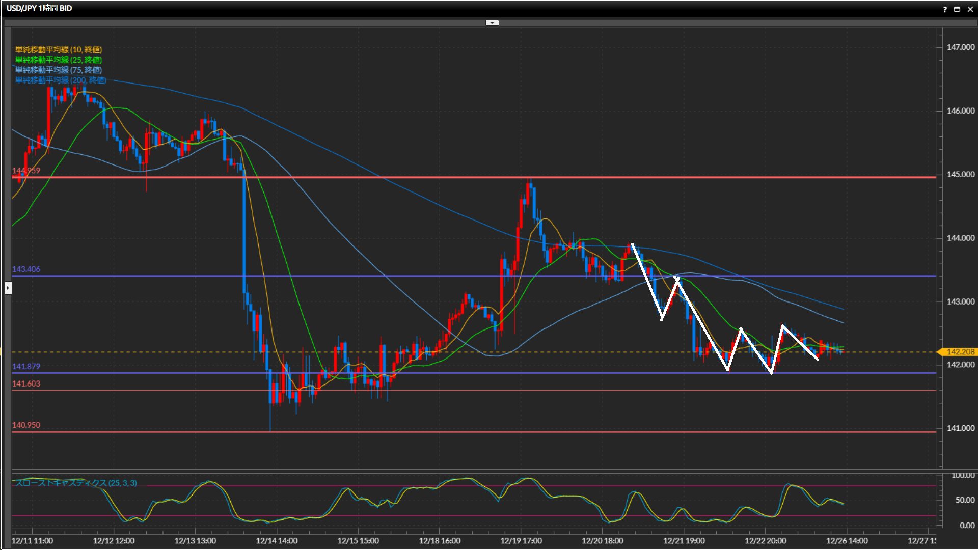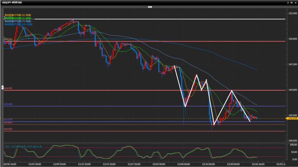 - ドル円は日足〜4時間足は下目線、1時間足はレンジ。