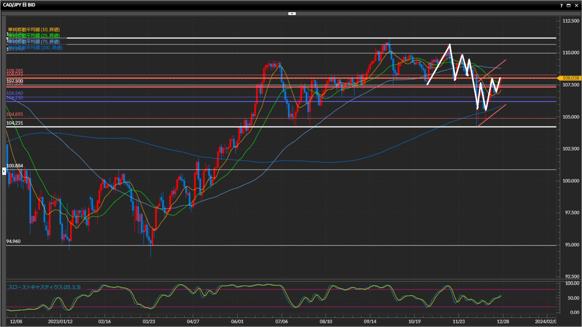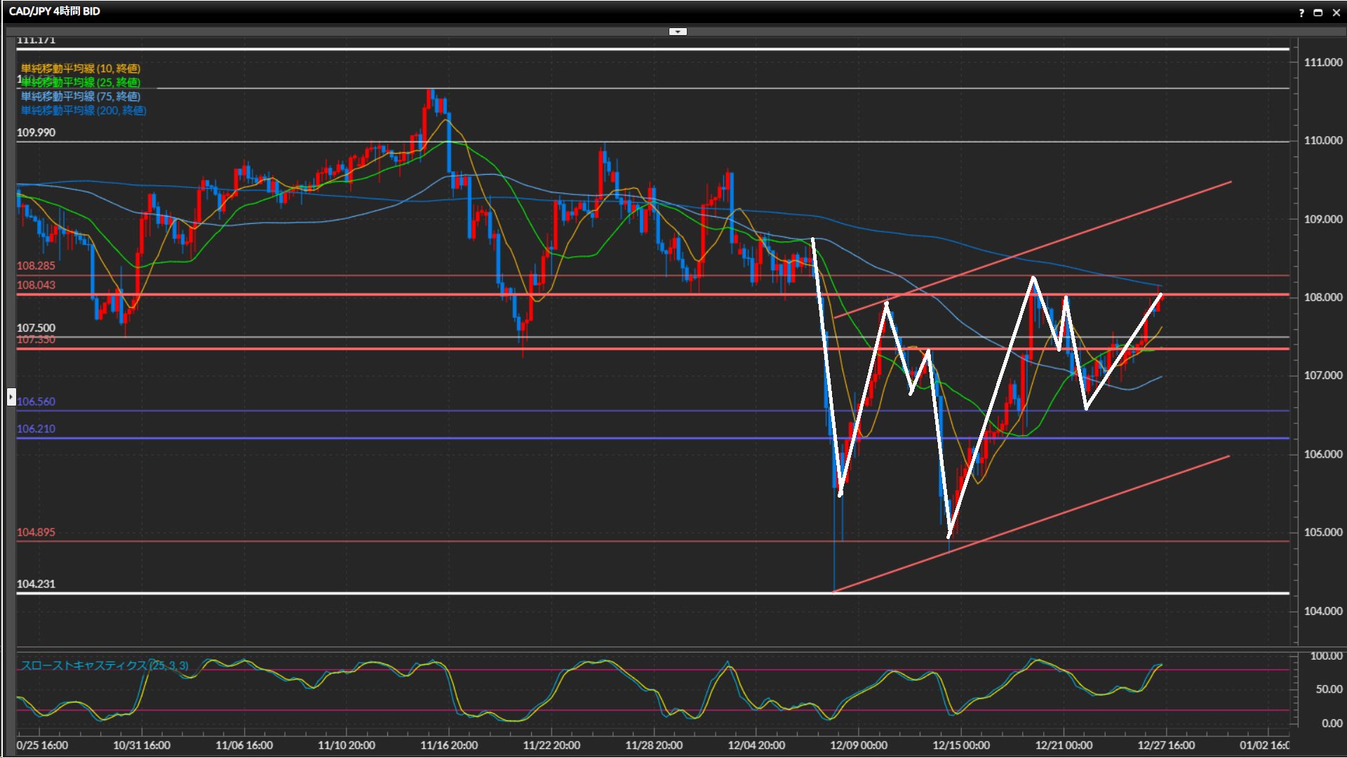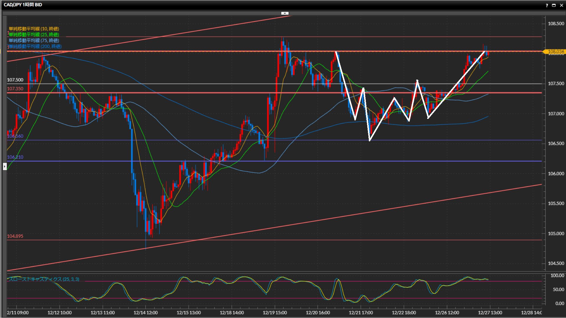 現在は直近高値の108.04円や108.29円の突破チャレンジ中。