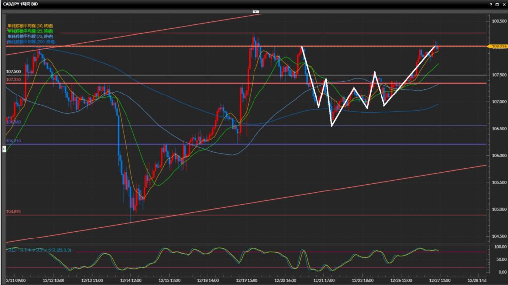 - 加ドル円は日足は上目線、4時間足は下目線終了、1時間足は上目線。