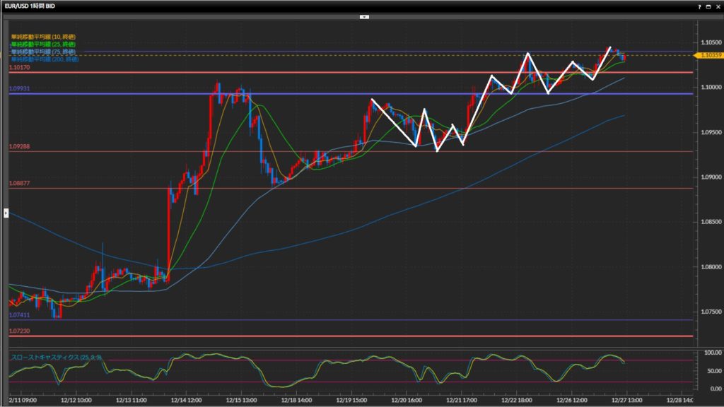 意識されている水平線1.1017ドルを突破したため、さらに高値更新を狙いたい。