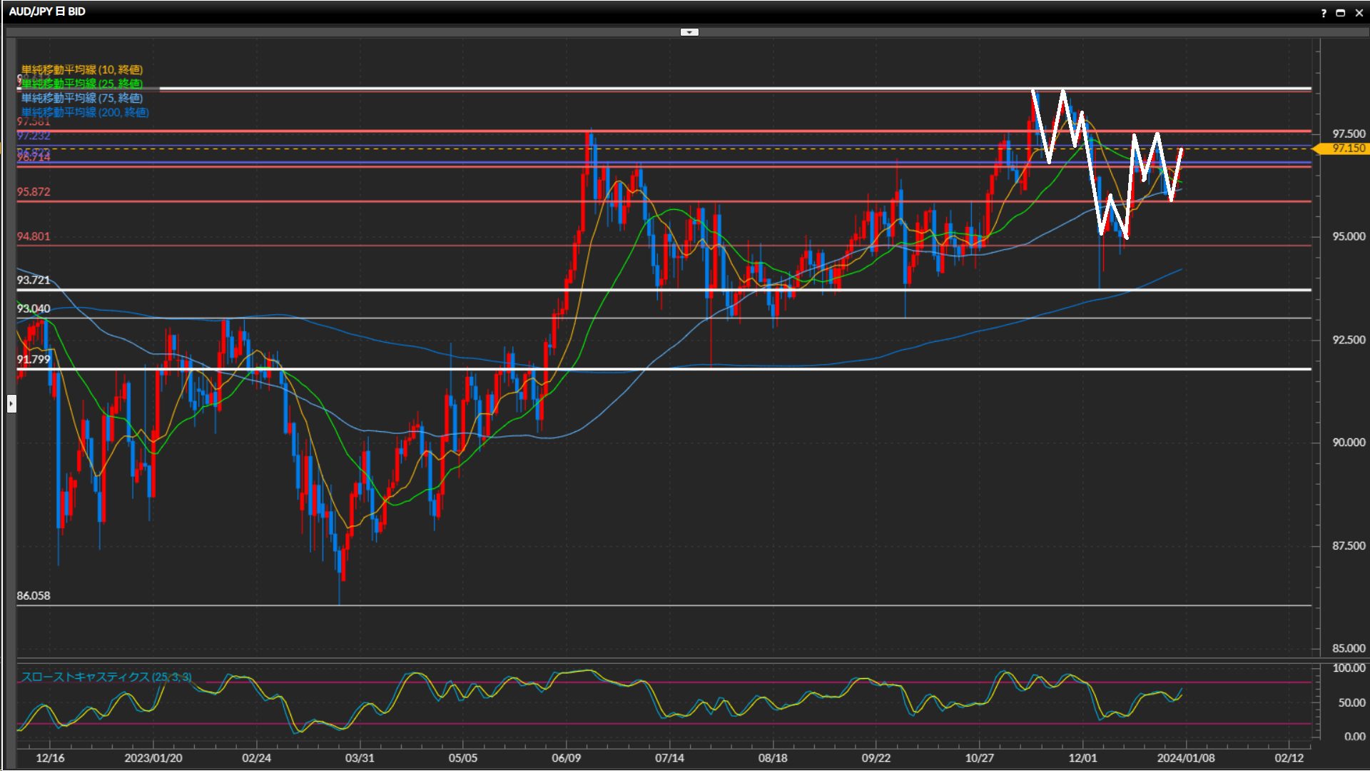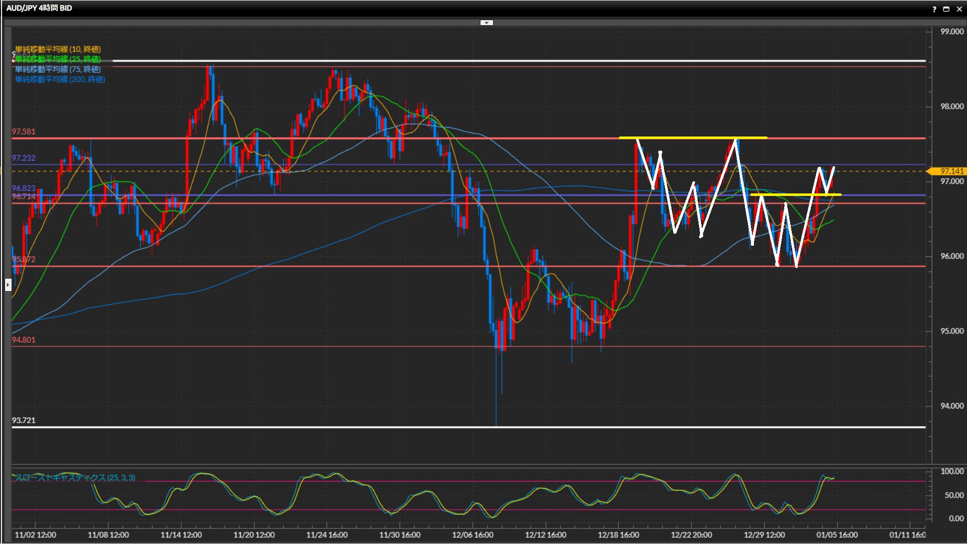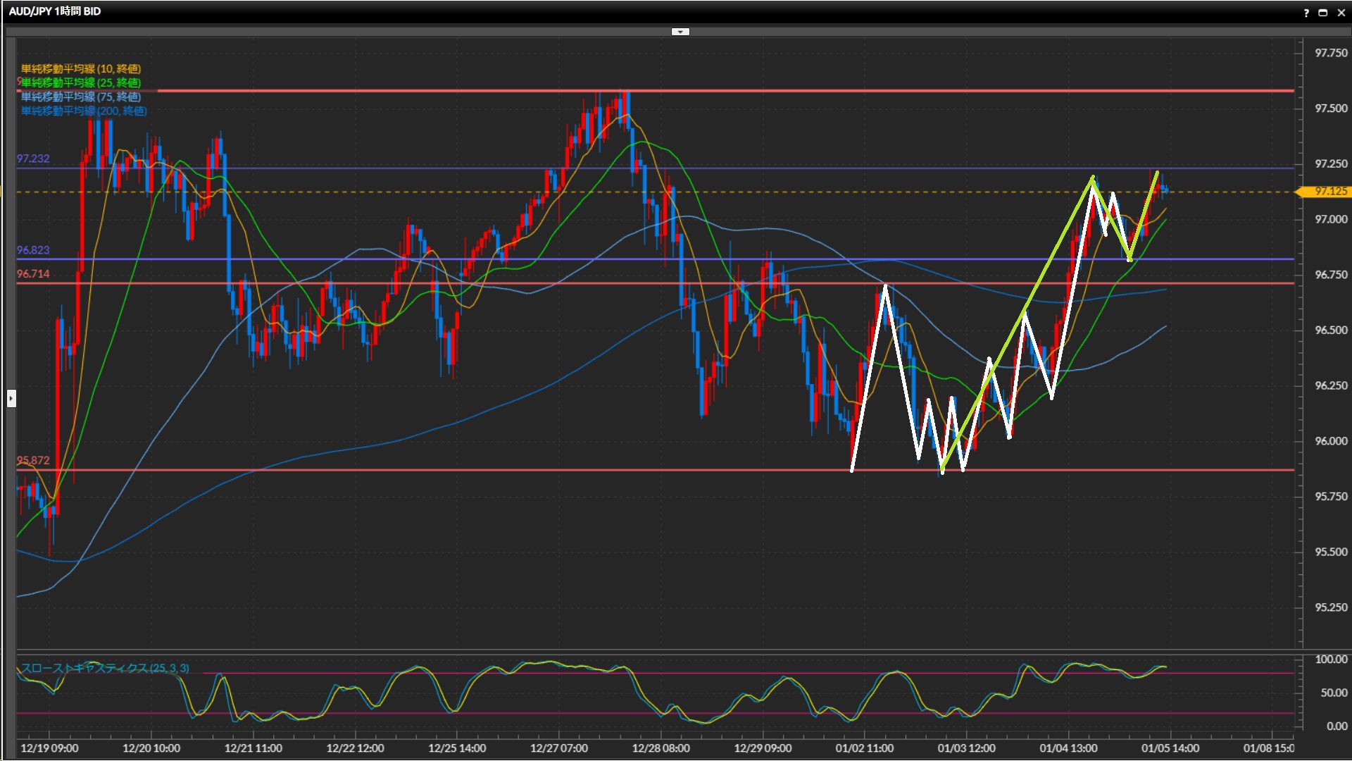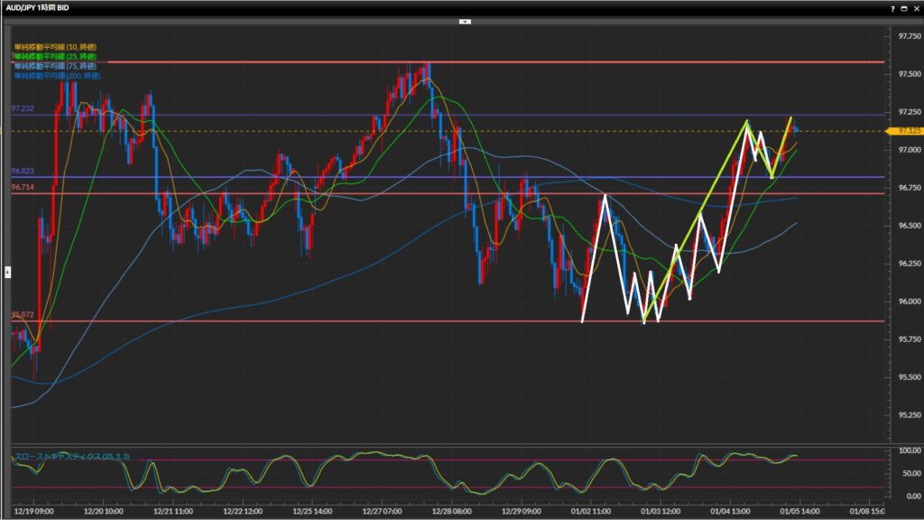 96.23円-97.23円のレンジと見て、上下どちらかへ抜けるまでは一旦様子見。